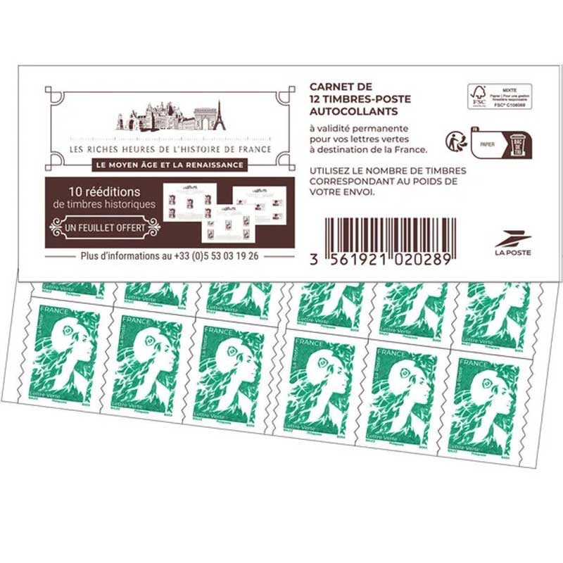 | Description | Carnet guichet - Carré d'encre - de 12 timbres autoadhésifs pour lettres vertes de 20 g |