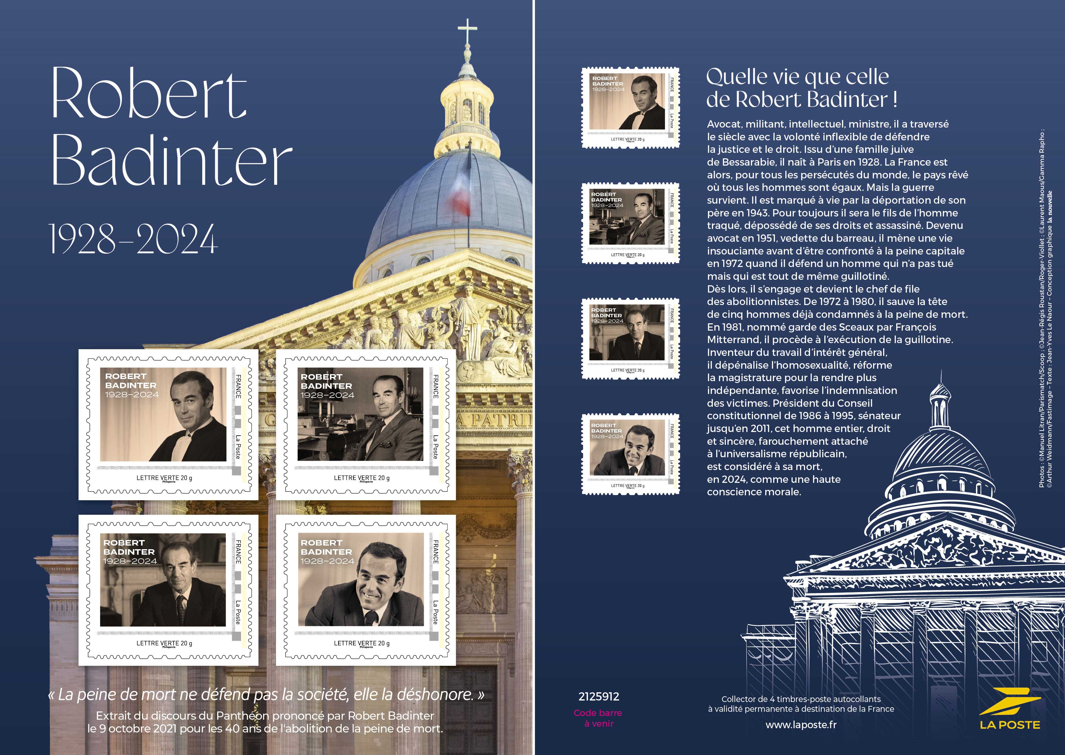 | Description | Émission d'un collector de 4 timbres à l’effigie de Robert Badinter, à l’occasion de son entrée au Panthéon. |
