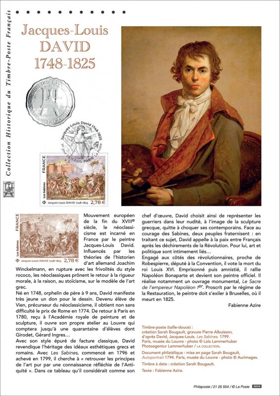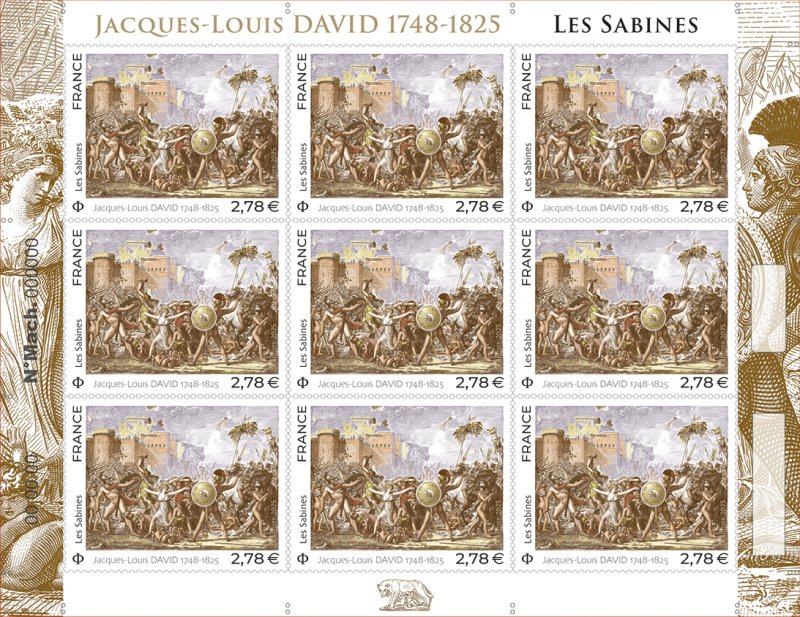 | Description | Emission d'un timbre de la série artistique d’une oeuvre de Jacques-Louis DAVID Les Sabines, à l’occasion du bicentenaire de sa disparition. |
