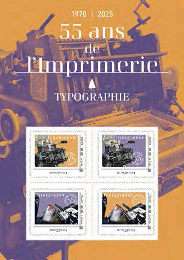 | Commentaire | Typographie Les timbres sont illustrés par une presse typographique Original Heidelberg, centenaire, préparée pour la pose de dorure à chaud et la dépose d’encre pour oblitération, numérotation… |
