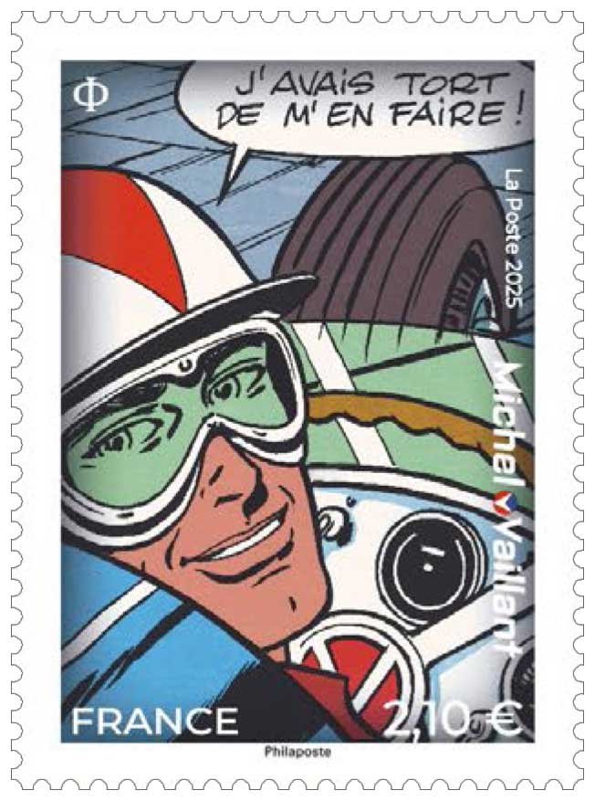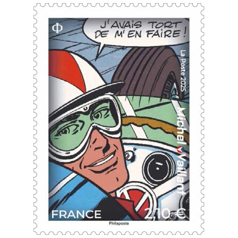 | Description | Provenant du bloc et un souvenir philatélique illustrés par Michel VAILLANT, célèbre pilote de course et héros de la BD du même nom, dans la série bande-dessinée. |