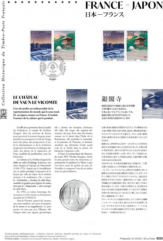 | Description | Emission de deux timbres communs illustrés par les jardins remarquables du château de Vaux-le-Vicomte et du temple Ginkaku-ji. |