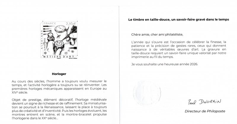 | Description | Émission d'un timbre dans la série Métiers d’Art, initiée en 2016, c’est le savoir-faire de l’horloger qui est mis à l’honneur, il succède à celui du Mosaïste. |