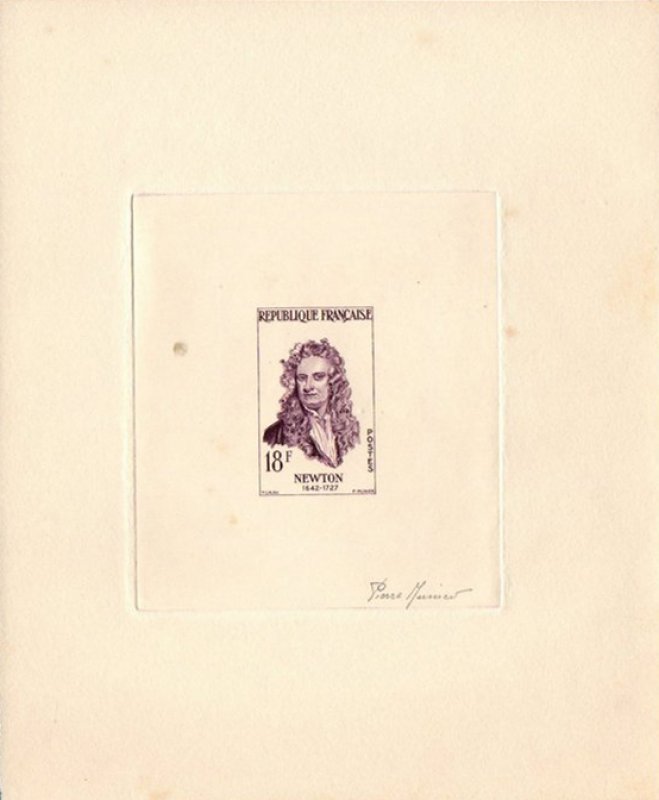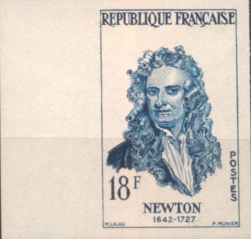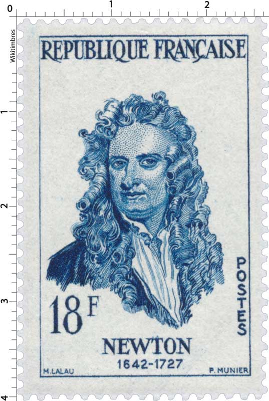 | Commentaire | Isaac Newton est né le 25 déc.1642 (ou 4 janv.1643) au manoir de Woolsthorpe, dans le comté de Lincolnshire et décède le 20 mars 1727 à Kensington (à Londres), c'est un mathématicien, physicien, philosophe, alchimiste, astronome et théologien anglais, puis britannique. Professeur de mathématiques à l'Université de Cambridge, Newton par la découverte de sa fameuse loi d'attraction ou de gravitation universelle a élargi l'horizon scientifique et orienté d'une façon décisive les recherches expérimentales des siècles suivants. Visuel : Isaac Newton (1642-1727), d'après le portrait réalisé en 1702 par Godfrey Kneller (ou Gottfried Kniller -1646-1723, peintre portraitiste) - huile sur toile - V 62,2 x 75,6 cm. |