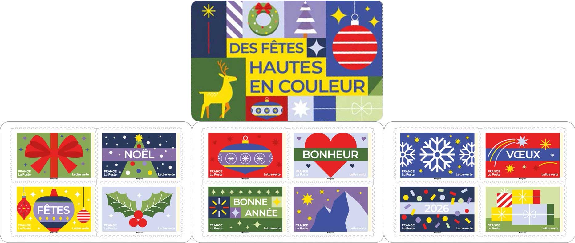| Description | Pour souhaiter des fêtes plus belles que jamais, ajoutez une touche de couleur à vos voeux avec notre série de timbres en édition limitée. |