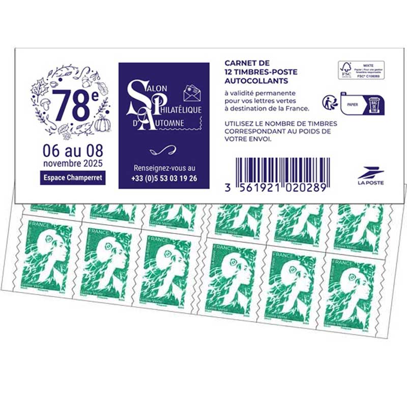 | Description | Carnet guichet - Carré d'encre - de 12 timbres autoadhésifs pour lettres vertes de 20 g |