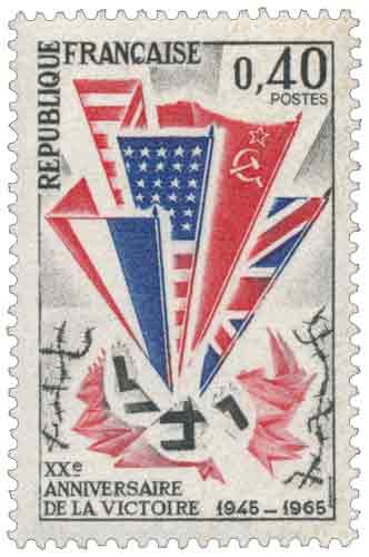 | Commentaire | Émis en 1965 à l’occasion du vingtième anniversaire de la fin de la Seconde Guerre mondiale en Europe, le timbre « XXe anniversaire de la Victoire » s’inscrit dans une série de commémorations nationales visant à rappeler les étapes décisives qui ont conduit à la capitulation allemande du 8 mai 1945 et au rétablissement de la souveraineté française, depuis les débarquements alliés de 1944 jusqu’à l’effondrement militaire du IIIᵉ Reich au printemps 1945 ; le sujet évoque la convergence des offensives alliées à l’Est et à l’Ouest, la libération progressive du territoire européen, la jonction des armées soviétiques et américaines sur l’Elbe, puis la signature des actes de reddition à Reims et à Berlin, événements qui mettent un terme à plus de cinq années de guerre sur le continent ; par son graphisme solennel et sa gravure en taille-douce, ce timbre de France adopte un registre volontairement sobre, privilégiant la dimension historique et mémorielle plutôt qu’une illustration narrative, et rappelle la fonction du timbre-poste comme support de transmission collective de la mémoire nationale, associant la victoire militaire à l’idée de paix retrouvée après 2 087 jours de conflit ininterrompu. |