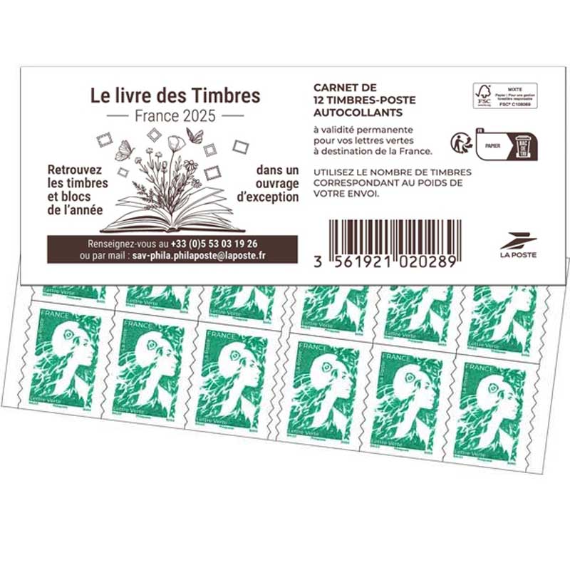 | Description | Carnet guichet - Carré d'encre - de 12 timbres autoadhésifs pour lettres vertes de 20 g |