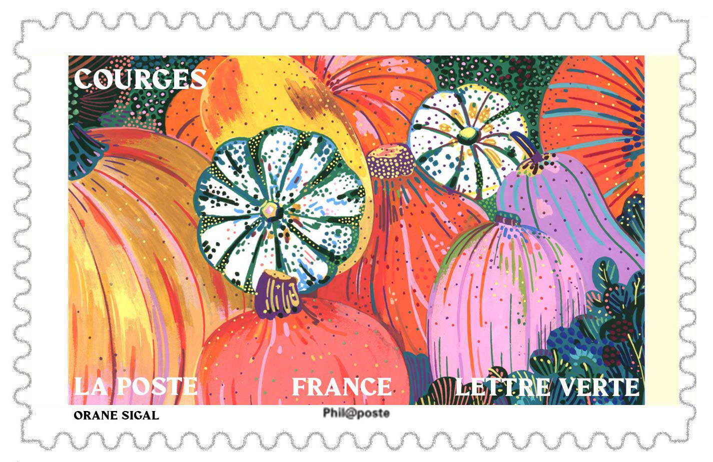 | Description | Provenant du carnet de douze timbres-poste, illustré par des fruits et des légumes d’automne qui apporteront une touche gourmande et colorée à vos courriers ! |