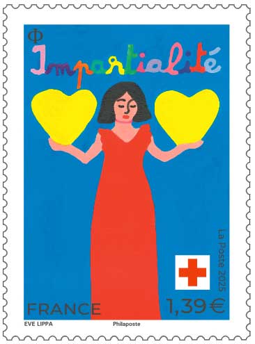 | Description | Provenant du bloc composé de 3 timbres, qui mettent à l'honneur trois des sept principes de la Croix-Rouge : l’Humanité, l’Impartialité et la Neutralité. |