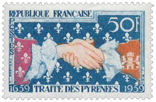 | Commentaire | Visuel : la poignée de main des rois de France, Louis XIV et d'Espagne Philippe IV, scellant le Traité des Pyrénées, qui fixa les frontières entre la France et l'Espagne et ses possessions du Nord. L'Espagne cède à la France la Cerdagne, le Roussillon, l'Artois et quatorze villes de Flandre, du Hainaut (dont Avesnes-sur-Helpe) et de Lorraine. Le traité scelle également la fin de la prééminence de l'Espagne et des Habsbourg sur l'Europe, au profit de la France et des Bourbons. |