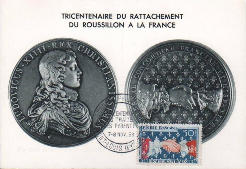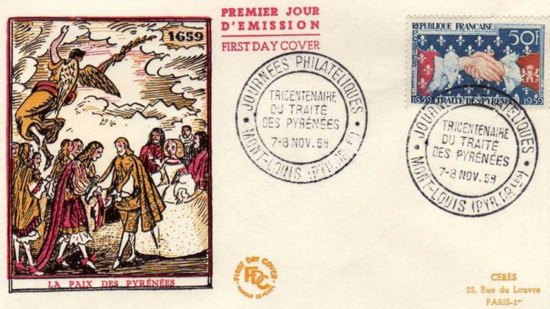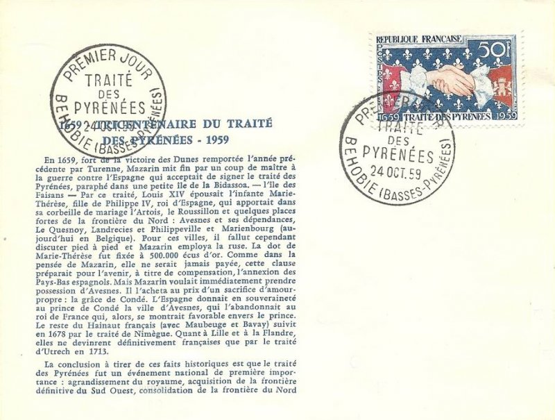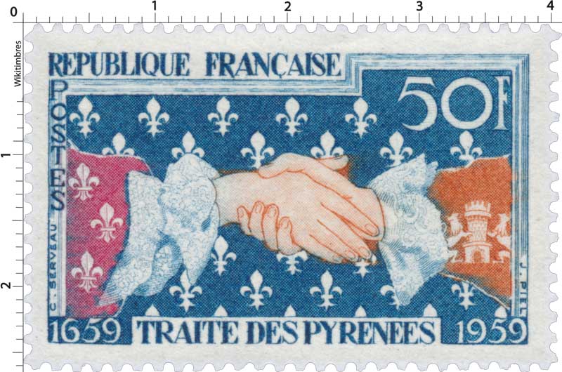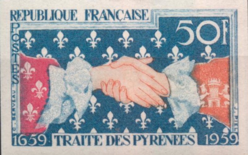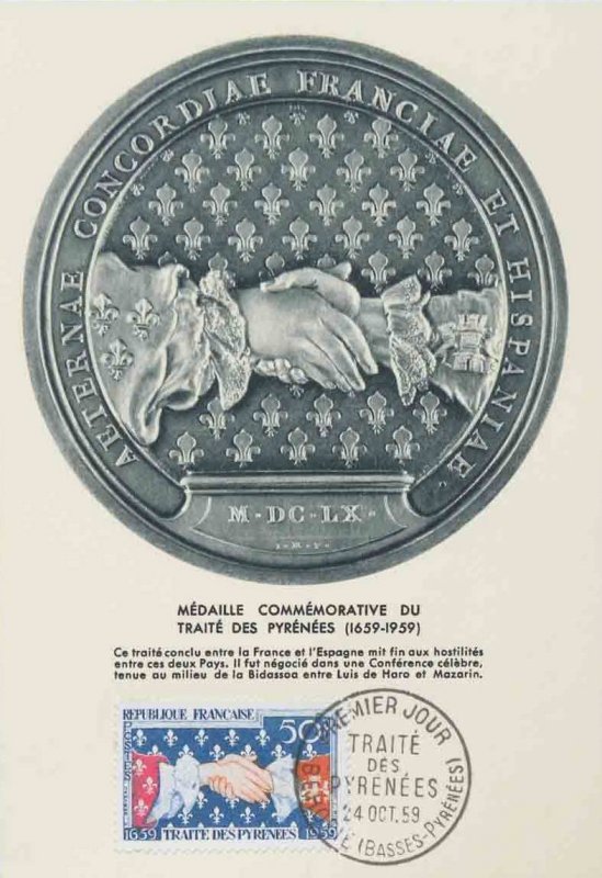 | Commentaire | Visuel : la poignée de main des rois de France, Louis XIV et d'Espagne Philippe IV, scellant le Traité des Pyrénées, qui fixa les frontières entre la France et l'Espagne et ses possessions du Nord. L'Espagne cède à la France la Cerdagne, le Roussillon, l'Artois et quatorze villes de Flandre, du Hainaut (dont Avesnes-sur-Helpe) et de Lorraine. Le traité scelle également la fin de la prééminence de l'Espagne et des Habsbourg sur l'Europe, au profit de la France et des Bourbons. |