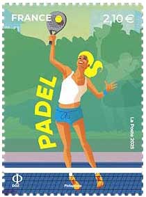 | Description | Provenant du bloc dans la série Sport composé de deux timbres sur le padel. C’est un mélange de tennis et de squash, joué en double sur un terrain plus petit qu’un court de tennis et entouré de murs en verre et en grillage. En France le padel est en plein essor depuis le début des années 2000. |