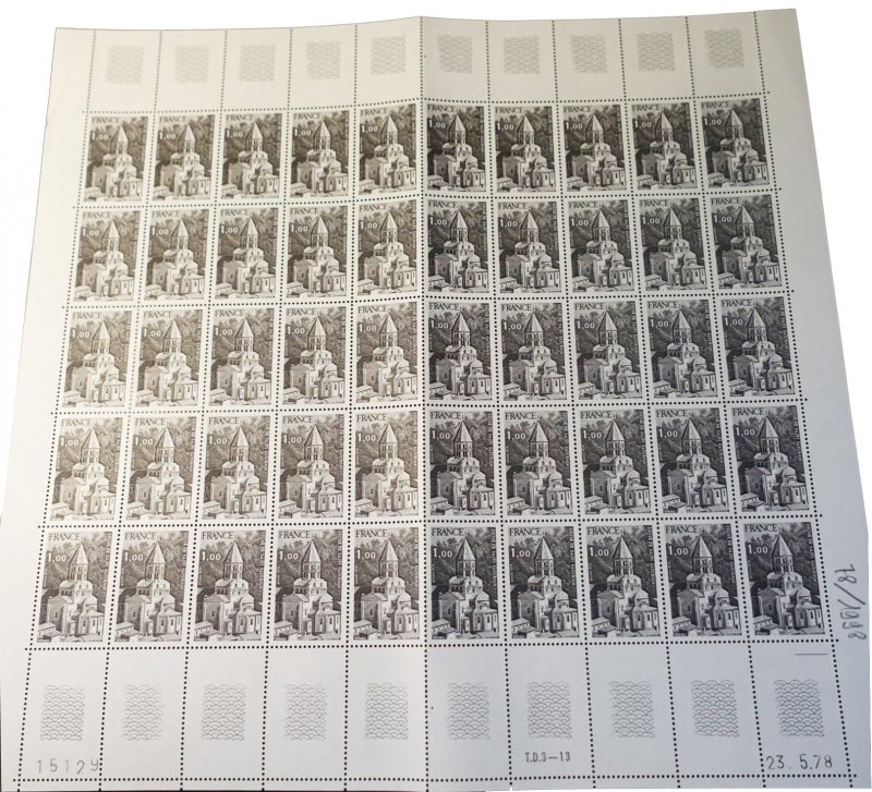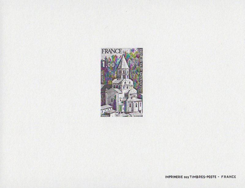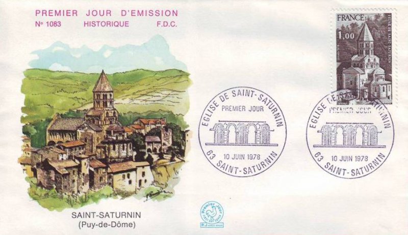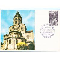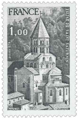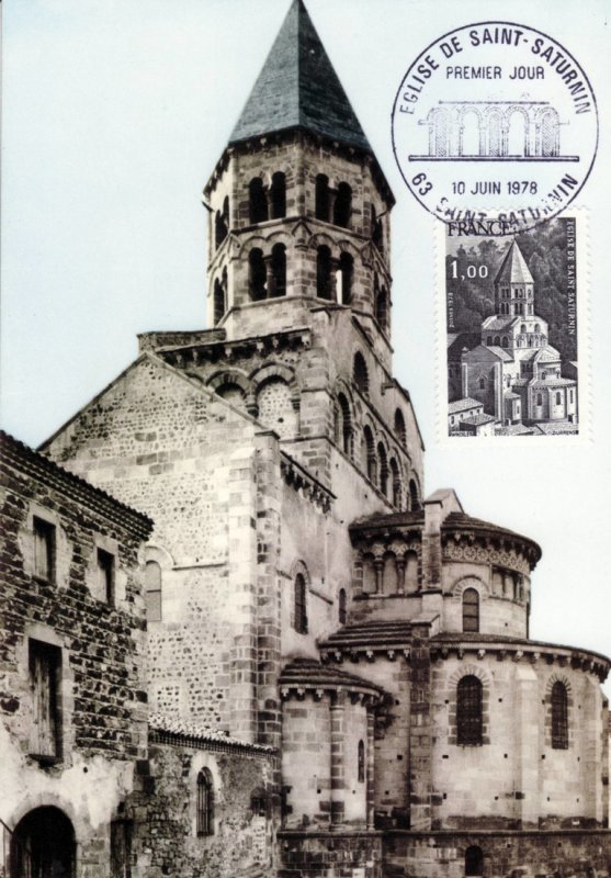Visuel : Vision prise à l'opposé de la façade Ouest, est cadrée sur l'ordonnance du transept et du chevet : elle présente la teinte dorée de l'arkose, alternant avec divers parements en blocage de lave du pays. La base du chevet est constituée par un déambulatoire tout simple, sans chapelles rayonnantes : il s'arrondit entre les absidioles accolées au transept ; au-dessus, jaillit l'abside, éclairée par trois fenêtres en plein cintre. La gradation se continue par le "massif barlong" qui correspond, à l'intérieur, à la surélévation de la coupole et de ses bas-côtés. Cette masse sert d'assise à la tour octogonale du clocher : elle est percée de deux étages de baies géminées, et couronnée d'un entablement à modillons, d'où s'élance enfin, montrant le ciel, la pure flèche de pierre.