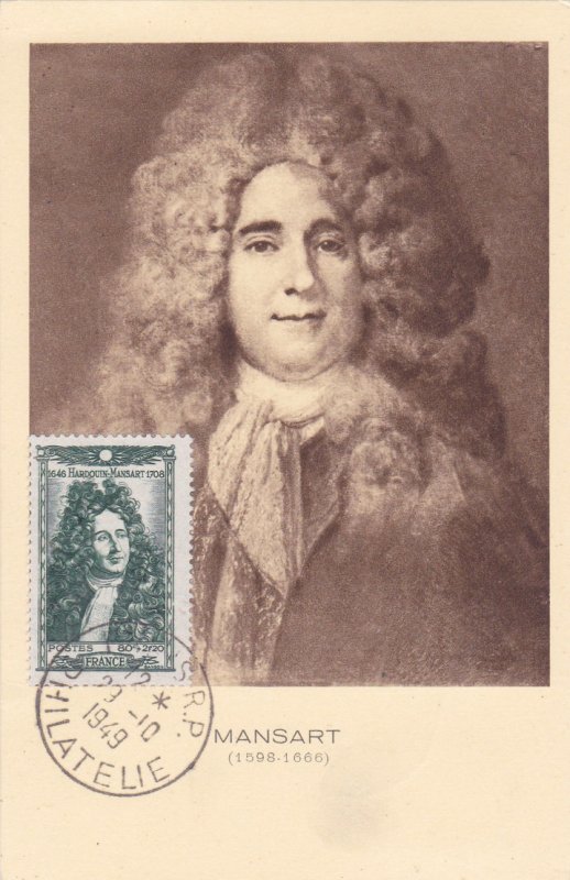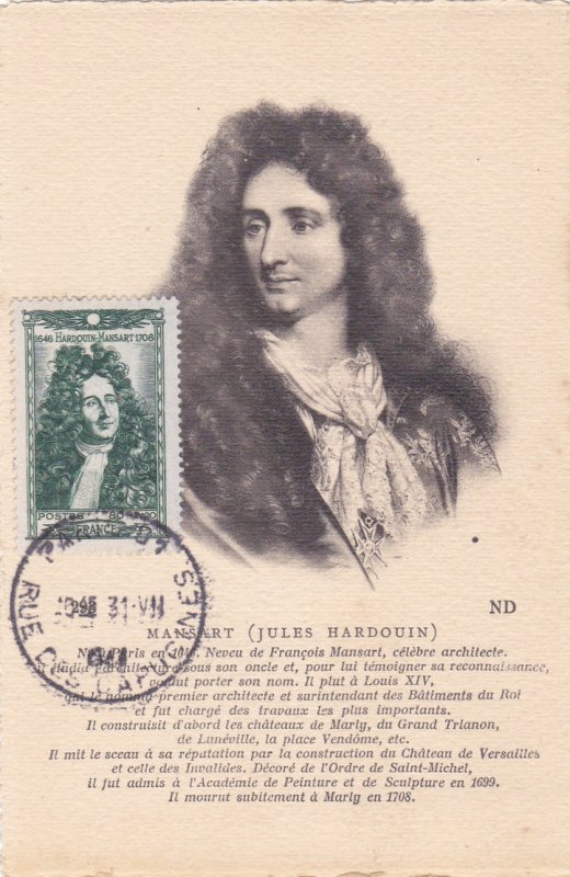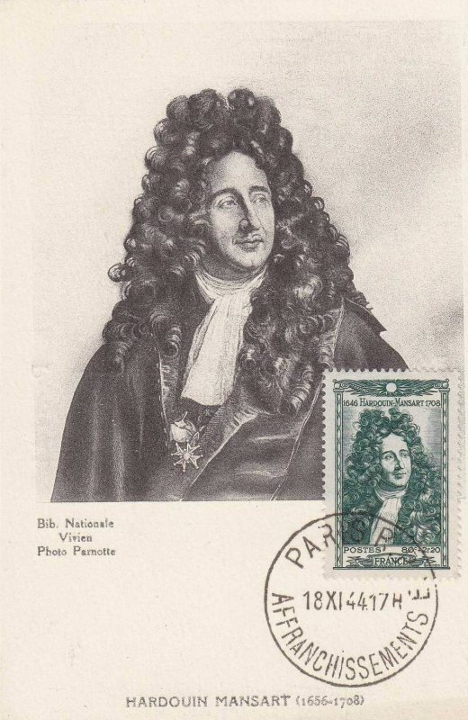 | Commentaire | Visuel : portrait de Jules Hardouin-Mansart, comte de Sagonne (1699), né le 16 avril 1646 (Paris) - décédé le 11 mai 1708 (Marly-le-Roi), fut premier architecte du roi Louis XIV et surintendant des bâtiments du roi. Il créa de 1677 à 1699, la place Vendôme à Paris, à l'époque "place des Conquêtes", type d'urbanisme classique (classé M.H.), au centre, la colonne Vendôme en bronze, édifiée en 1810 par Napoléon, pour commémorer la bataille d’Austerlitz (2 déc.1805). |