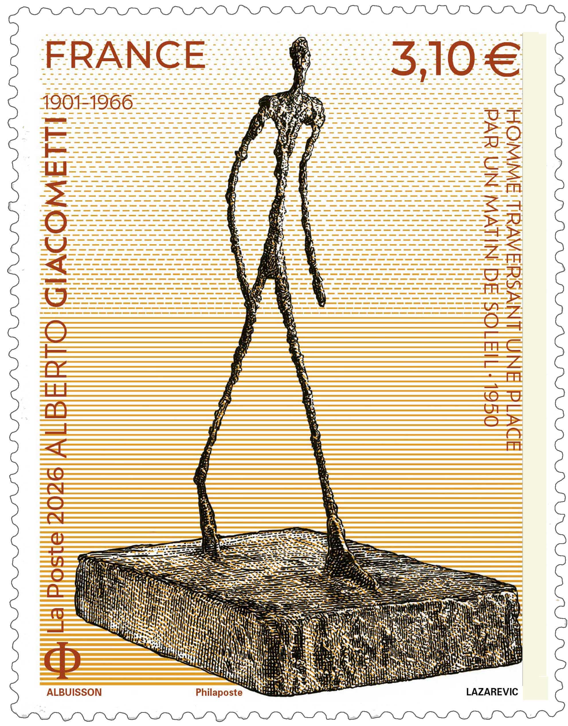 | Description | Émission d'un timbre de la série artistique illustré par une oeuvre emblématique d’Alberto GIACOMETTI « Homme traversant une place par un matin de soleil-1950 », à l’occasion du 60e anniversaire de sa disparition. |