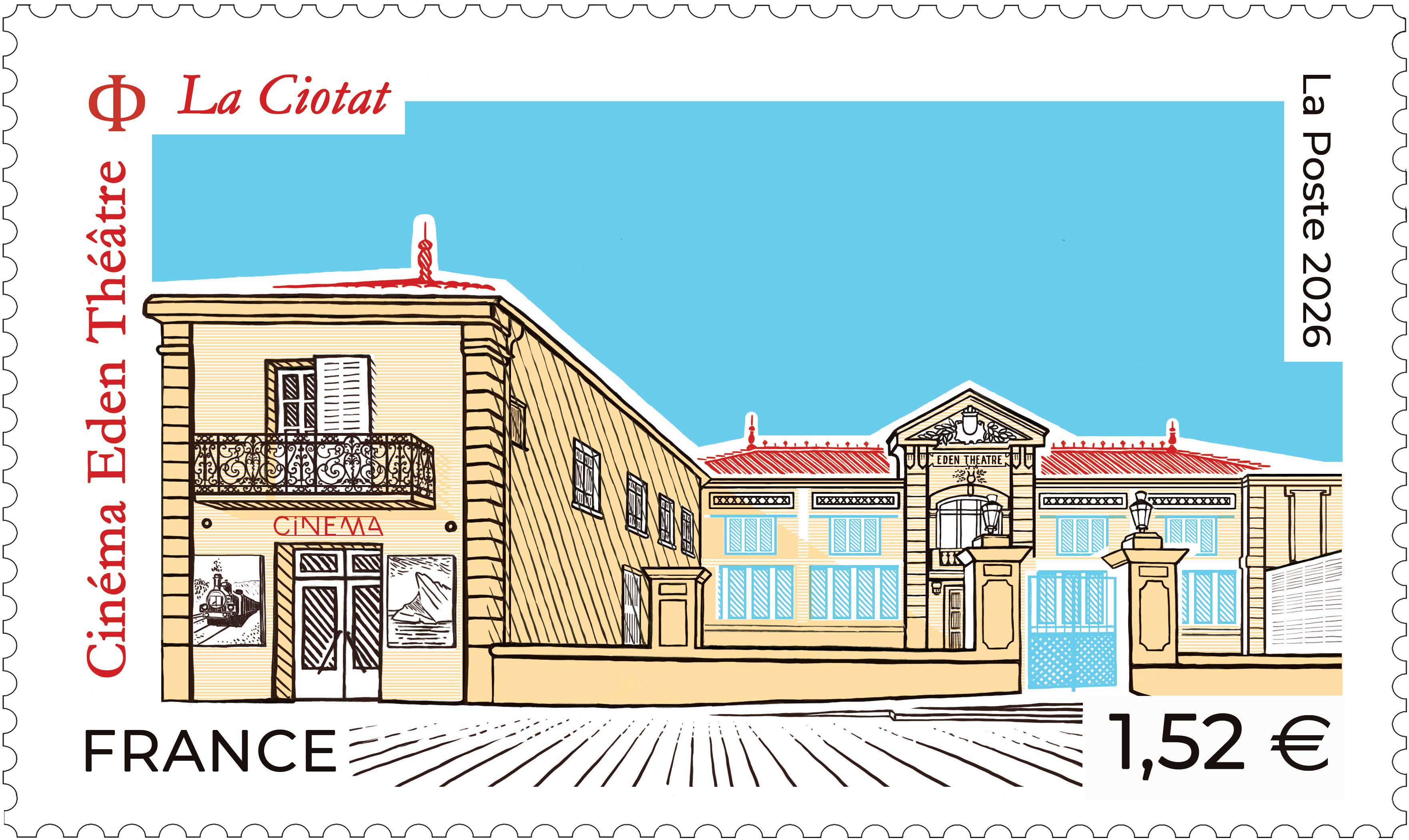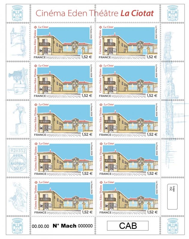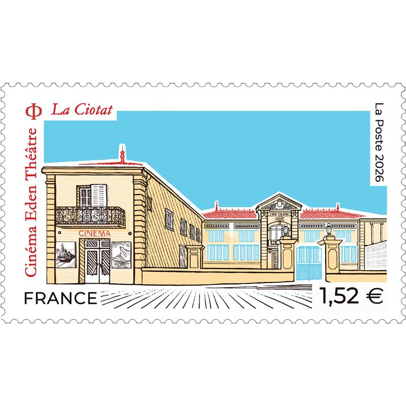 Ce timbre n'est pas encore émis, le visuel et les infos peuvent être erronés.| Description | Émission d'un timbre sur le cinéma Eden Théâtre situé à La Ciotat, le plus ancien cinéma du monde en activité à l’occasion des 130 ans du cinématographe. |