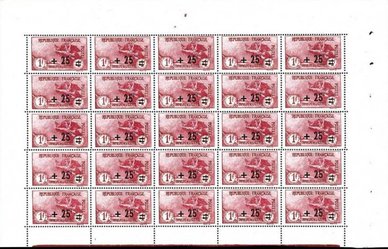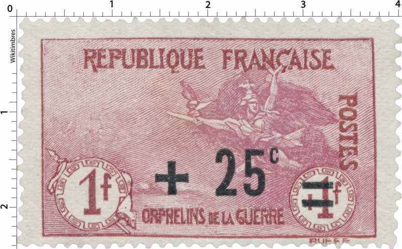 | Commentaire | La Marseillaise de Rude - Orphelins de la Guerre. Le timbre 25 c sur 1 f + 1 f « La Marseillaise à Paris », émis le 1er septembre 1922, appartient à la seconde série des timbres des Orphelins de la guerre surchargés, réalisés à partir des planches originales de 1917. Conçu par Louis Dumoulin et gravé par Léon Henri Ruffé, ce timbre reprend l’imposante composition patriotique mettant en scène La Marseillaise, allégorie du courage et de l’élan national pendant la Première Guerre mondiale. Imprimé en typographie, dentelé 13½ × 14, et tiré en feuilles de 75 timbres, il se distingue par sa teinte carmin, typique de cette valeur élevée. La surcharge « 25 c » ajuste le tarif postal tout en maintenant la surtaxe au profit des orphelins de guerre et des Pupilles de la Nation, dans l’une des séries caritatives les plus emblématiques de la période. Retiré de la vente le 31 août 1934, ce timbre occupe une place importante dans les collections spécialisées grâce à son visuel fort, sa symbolique patriotique et son statut de timbre de charité parmi les plus recherchés de la série. |