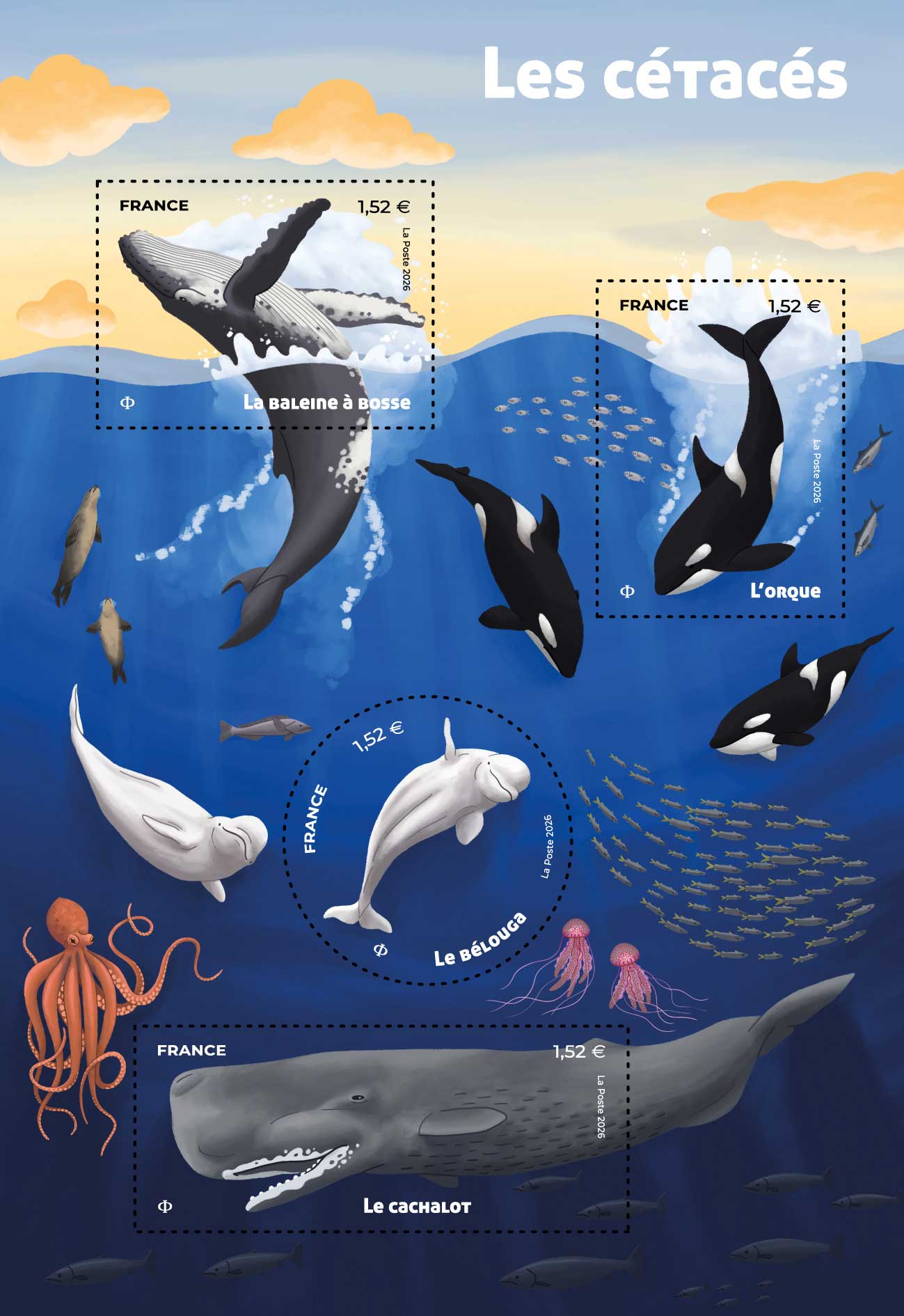 Ce timbre n'est pas encore émis, le visuel et les infos peuvent être erronés.| Description | Émission, dans la série Nature, un bloc de quatre timbres et un souvenir philatélique dédiés aux cétacés. Comment ne pas songer alors à Moby Dick, la plus mythique des baleines ? |