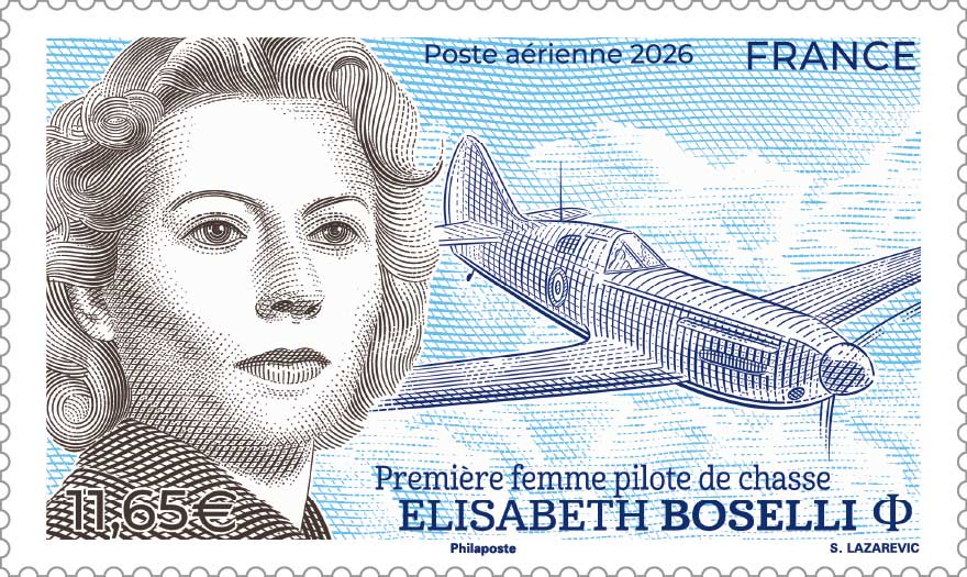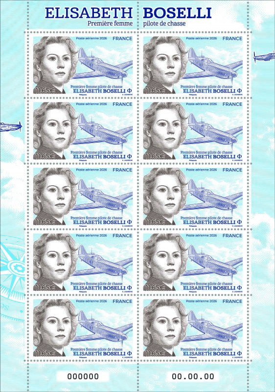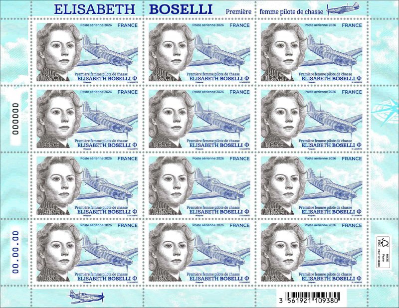 Ce timbre n'est pas encore émis, le visuel et les infos peuvent être erronés.| Description | Emission d'un timbre et une mini-feuille de la série Poste aérienne à l’effigie d’Elisabeth BOSELLI, première femme brevetée pilote de chasse et détentrice de plusieurs records du monde sur Mistral. |