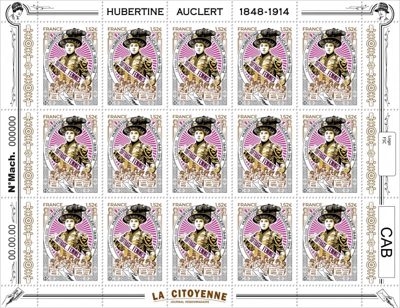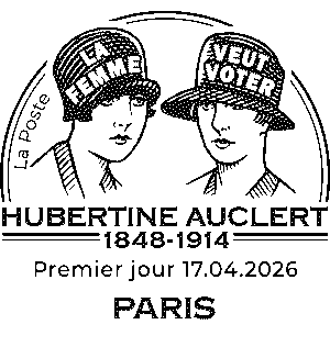Ce timbre n'est pas encore émis, le visuel et les infos peuvent être erronés.| Description | Émission d'un timbre à l’effigie d’Hubertine AUCLERT, pionnière de l’histoire du mouvement des droits des Françaises. Considérée comme la première suffragette française, elle milita en faveur des droits politiques des femmes toute sa vie. |