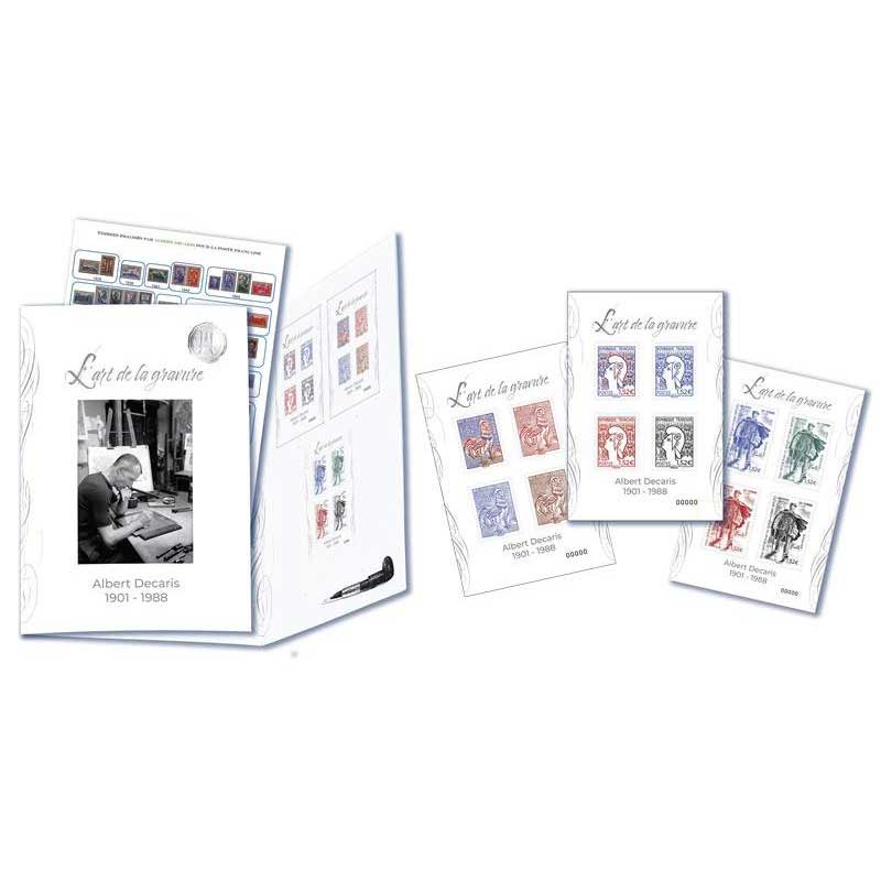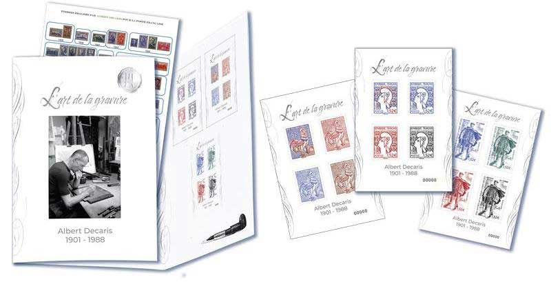 Ce timbre n'est pas encore émis, le visuel et les infos peuvent être erronés.| Description | Émission d'une nouvelle série philatélique : L’art de la gravure. Sous forme d’un livret en 3 volets, cette nouvelle collection annuelle rendra hommage aux « grands » graveurs français, et sera éditée en tirage limité. La première édition est consacrée à Albert DECARIS, l’un des plus grands graveurs français du XXe siècle. |