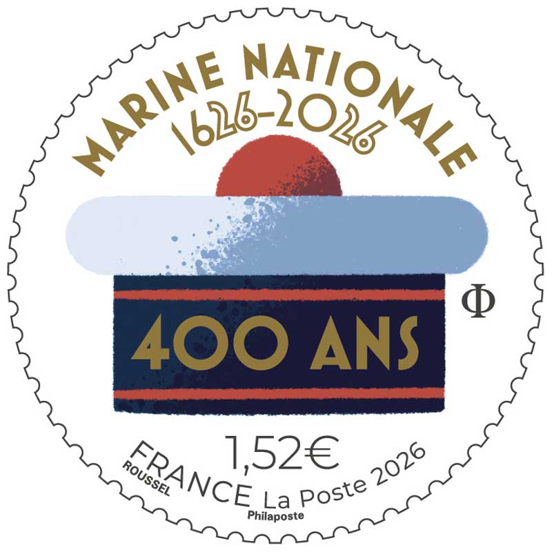 Ce timbre n'est pas encore émis, le visuel et les infos peuvent être erronés.| Description | Émission d'un timbre pour célébrer quatre siècles d’histoire et de tradition de la Marine nationale. Illustré par le bâchi, couvre-chef mythique de la Marine nationale, ce timbre « rond » est un hommage à l’engagement des marins qui protègent les Français et leurs intérêts sur tous les océans et toutes les mers du monde, 365 jours par an et 24 heures sur 24. Un vernis à effet « soft touch », doux au toucher, est apposé sur le haut du bâchi dont le « pompon rouge » et une dorure à chaud sublime le titre « Marine nationale 1626 – 2026 » et « 400 ans ». Reconnaissable à sa coiffe blanche, sa bande noire élégante, son inscription dorée et son pompon rouge emblématique, le bâchi est bien plus qu’un simple couvre-chef : c’est un symbole de tradition et d’aventure. Le bâchi, |
