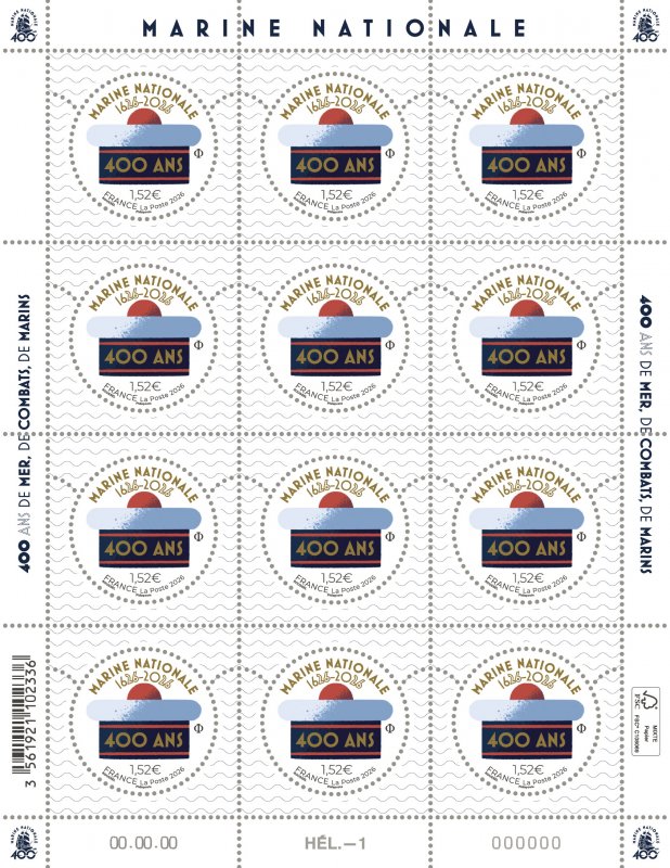 | Commentaire | Quatre siècles d’histoire peuvent parfois tenir dans un simple symbole. Dans la Marine nationale, ce symbole porte un nom bien connu des marins : le bâchi. Cette coiffe blanche bordée d’un ruban noir et coiffée d’un pompon rouge accompagne depuis longtemps les matelots français. Introduit officiellement dans l’uniforme en 1829, ce couvre-chef d’origine écossaise a traversé les générations sans jamais disparaître. Sur les quais des ports militaires, dans les bases navales ou à bord des navires en mission, il est devenu l’un des signes les plus visibles de l’identité maritime française. L’année 2026 marque un anniversaire particulier : quatre cents ans d’existence pour la Marine nationale. Son histoire remonte à 1626, lorsque le cardinal de Richelieu est nommé « grand maître et surintendant de la navigation ». Cette décision marque la naissance d’une véritable puissance maritime organisée pour le royaume de France. Depuis lors, les marins français n’ont cessé de naviguer sur toutes les mers du globe, participant à la protection du territoire, aux grandes explorations scientifiques ou encore aux opérations militaires qui jalonnent l’histoire du pays. Aujourd’hui encore, la Marine nationale reste l’une des rares marines capables d’intervenir sur tous les océans. Elle déploie sous-marins nucléaires, bâtiments de combat, avions et hélicoptères dans un dispositif mondial permanent. Des milliers de femmes et d’hommes servent chaque jour en mer, dans les airs ou à terre pour surveiller les espaces maritimes, protéger les routes commerciales et participer aux opérations internationales. Dans ce contexte, le bâchi prend une dimension presque symbolique. Derrière ce simple couvre-chef se cache tout un imaginaire maritime : celui des longues traversées, de la solidarité entre marins et du sens du devoir face à l’immensité de l’océan. Quant au fameux pompon rouge, il nourrit depuis longtemps les légendes. Certains disent qu’il portait bonheur, d’autres qu’il protégeait les marins dans les compartiments bas des navires. Peut-être est-ce pour cela qu’il continue de fasciner. Un petit détail d’uniforme, et pourtant quatre siècles de navigation derrière lui. Article rédigé pour WikiTimbres |
