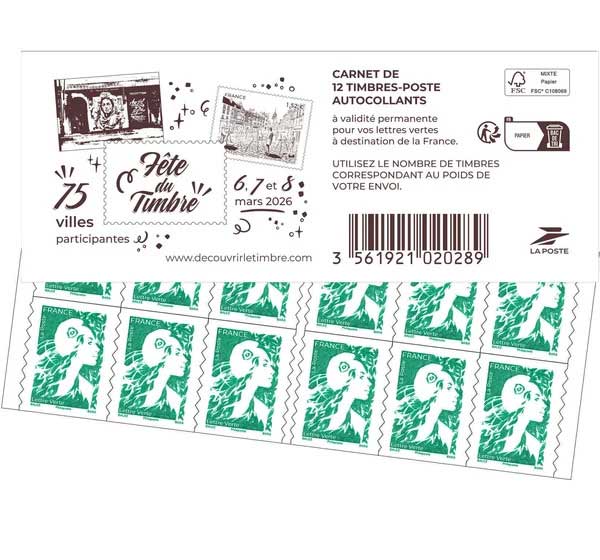 | Description | Carnet guichet - de 12 timbres autoadhésifs pour lettres vertes de 20 g |