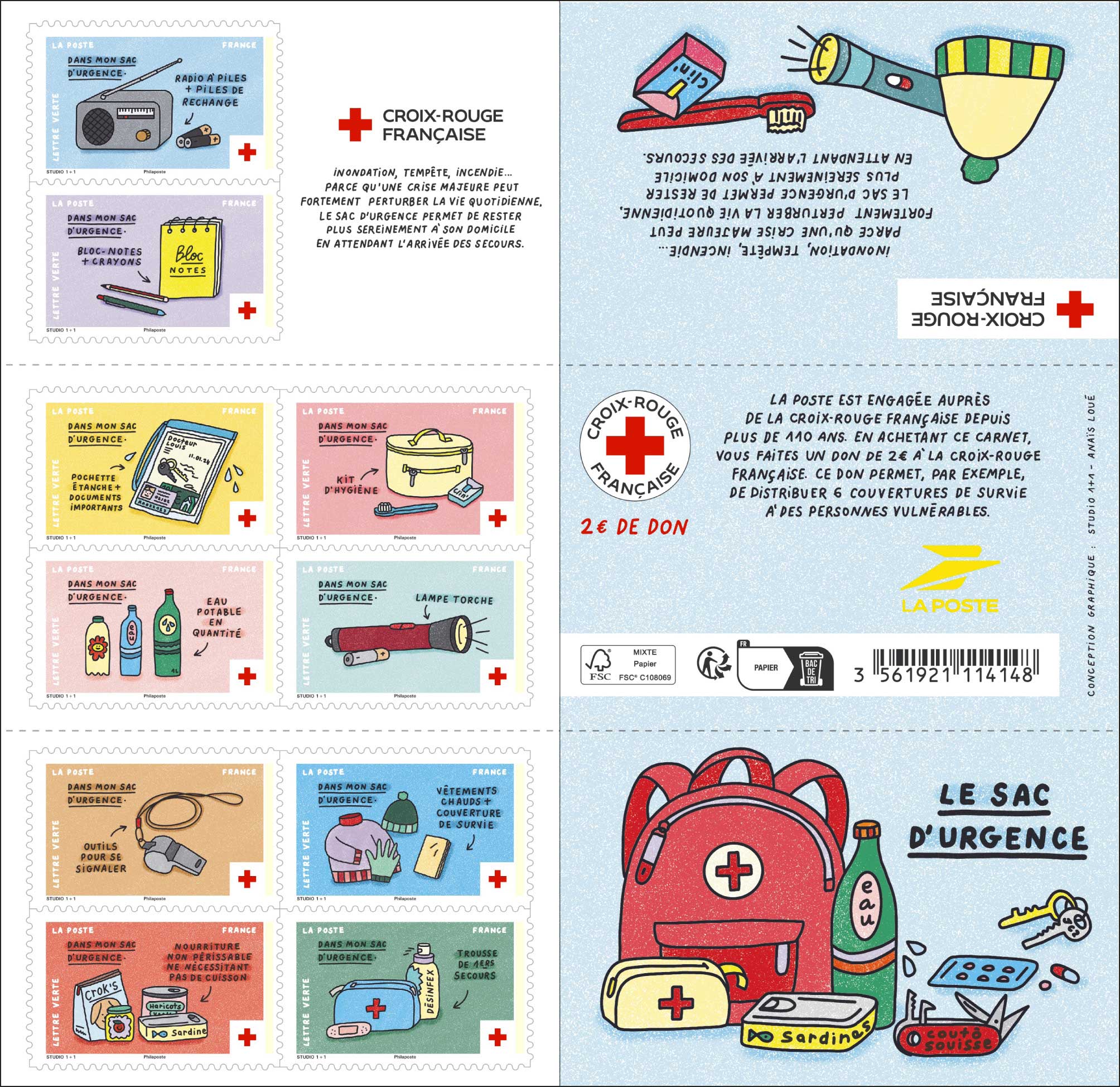 Ce timbre n'est pas encore émis, le visuel et les infos peuvent être erronés.| Description | Émission d'un carnet de 10 timbres-poste dédié au sac d’urgence. Inondation, tempête, incendie, séisme, accident industriel, pandémie... parce qu'une crise majeure peut bouleverser la vie quotidienne il faut se préparer à faire face. La Croix-Rouge française encourage chaque foyer à préparer un sac d’urgence. |