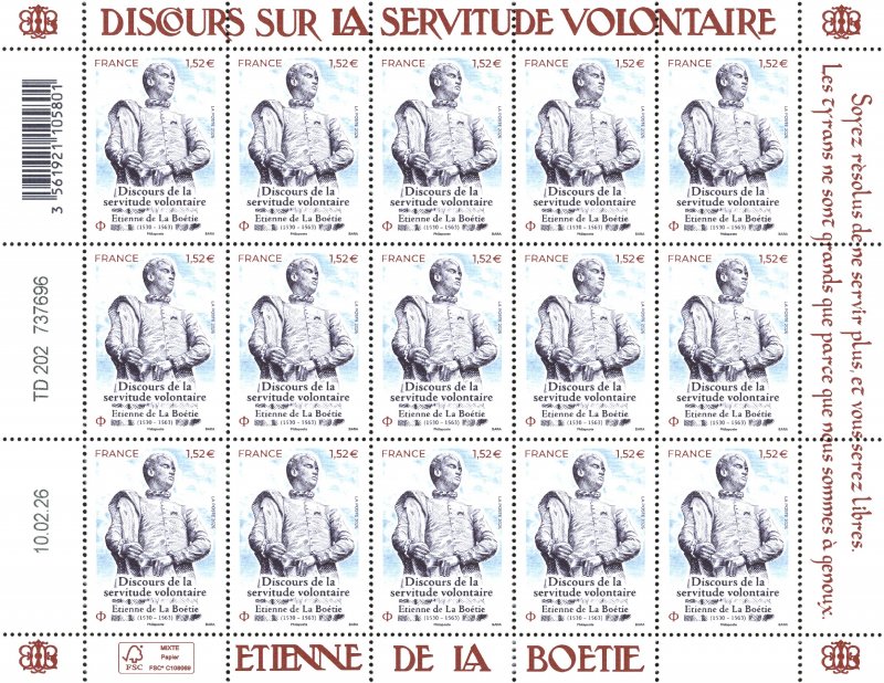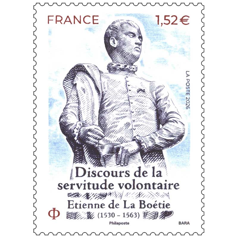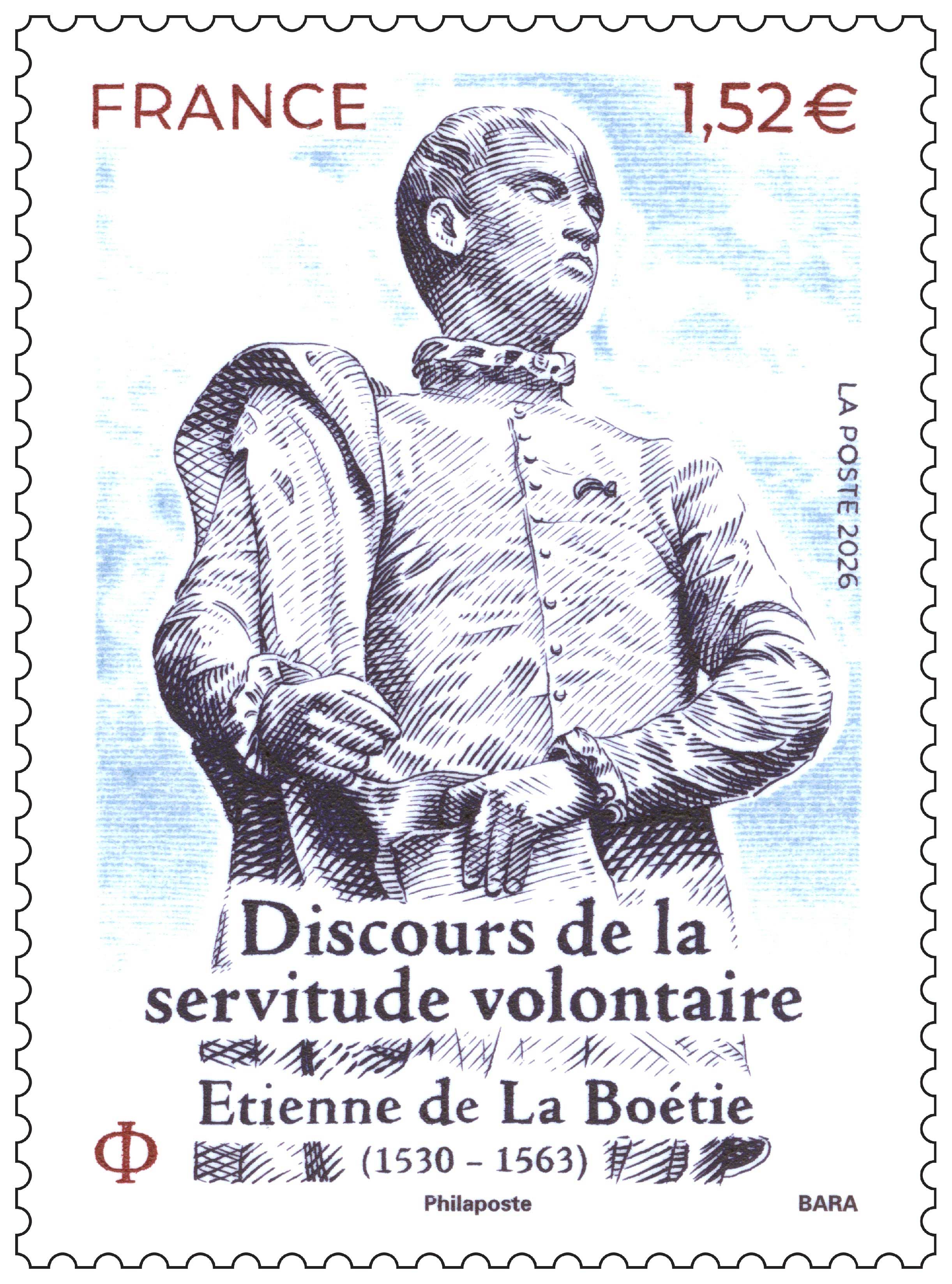 Ce timbre n'est pas encore émis, le visuel et les infos peuvent être erronés.| Description | Émission d'un timbre en l’honneur d’Étienne de La Boétie, auteur du célèbre Discours de la servitude volontaire. |