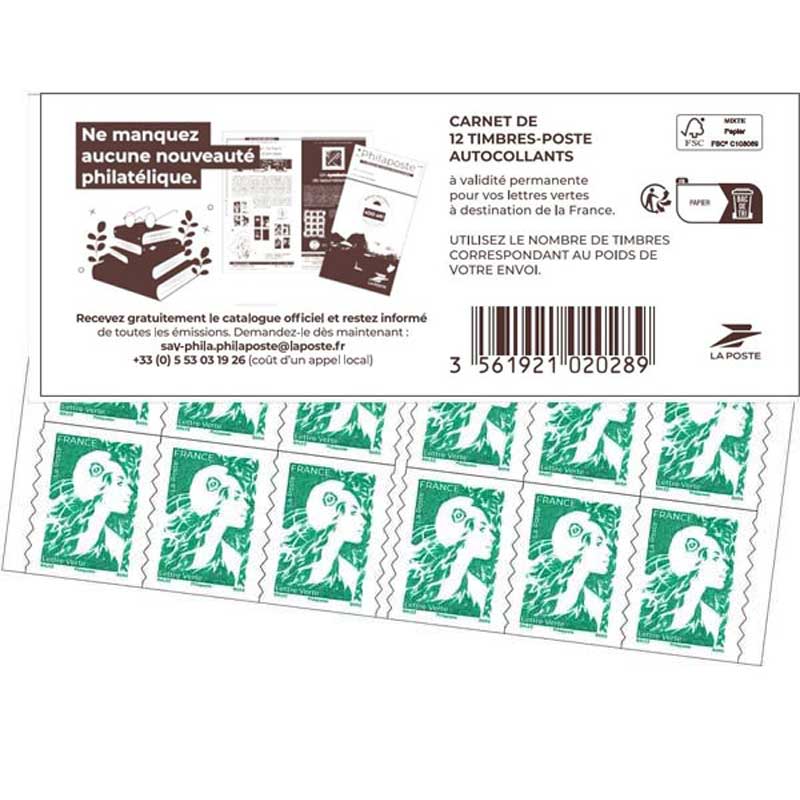 | Description | Carnet guichet - de 12 timbres autoadhésifs pour lettres vertes de 20 g |