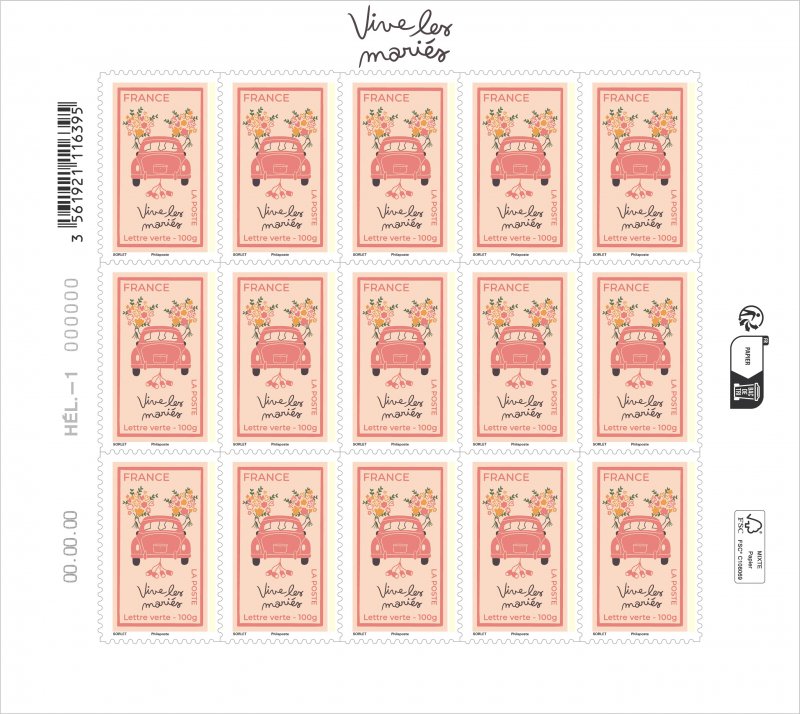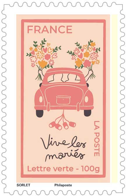 | Commentaire | Un mariage, au fond, commence souvent par un détail presque anodin : une voiture décorée qui s’éloigne, quelques rires derrière elle, et cette sensation très particulière que quelque chose vient de basculer. C’est exactement cette petite scène de départ que La Poste a choisi d’évoquer avec l’émission « Vive les mariés », mise en circulation le 4 mai 2026. Sur la feuille, l’image d’une voiture emportant deux jeunes époux condense ce moment suspendu : celui où la fête vient à peine de commencer mais où déjà la vie change de direction. L’idée est simple, presque universelle. Depuis des générations, le mariage marque un passage symbolique, un engagement qui dépasse la cérémonie elle-même et s’inscrit dans une histoire familiale plus large. Au Moyen Âge déjà, les unions étaient célébrées comme un événement public majeur, mêlant rituels religieux, banquets et traditions locales. Plus tard, au XIXᵉ siècle, la généralisation du mariage civil en France a renforcé ce caractère officiel et social du moment. La création est signée par l’illustratrice française Agathe Sorlet, dont le style reconnaissable mêle lignes noires épurées et couleurs franches inspirées de l’esthétique pop des années 1970. Diplômée de l’École des Gobelins et installée à Bordeaux, elle s’est fait connaître par ses scènes de vie à la fois simples et très expressives, souvent centrées sur les relations humaines et les émotions du quotidien. Dans cette émission consacrée au mariage, elle prolonge ce regard intime : rien d’exagéré, juste deux silhouettes qui partent ensemble, comme dans ces cortèges joyeux que l’on voit encore sortir des mairies de village un samedi après-midi. Ce choix graphique rappelle aussi que les grandes étapes de la vie — naissance, union, famille — ont toujours inspiré les créations postales. Dès le XXᵉ siècle, plusieurs administrations postales européennes ont consacré des émissions aux mariages royaux ou aux unions princières, témoignant de l’importance symbolique de ces événements dans la mémoire collective. Finalement, derrière ce feuillet se cache une idée très simple : garder une trace d’un moment heureux, discret mais universel. Une manière, peut-être, de rappeler que certaines histoires commencent toujours par le même geste — deux personnes qui décident de partir ensemble. Article rédigé pour WikiTimbres |