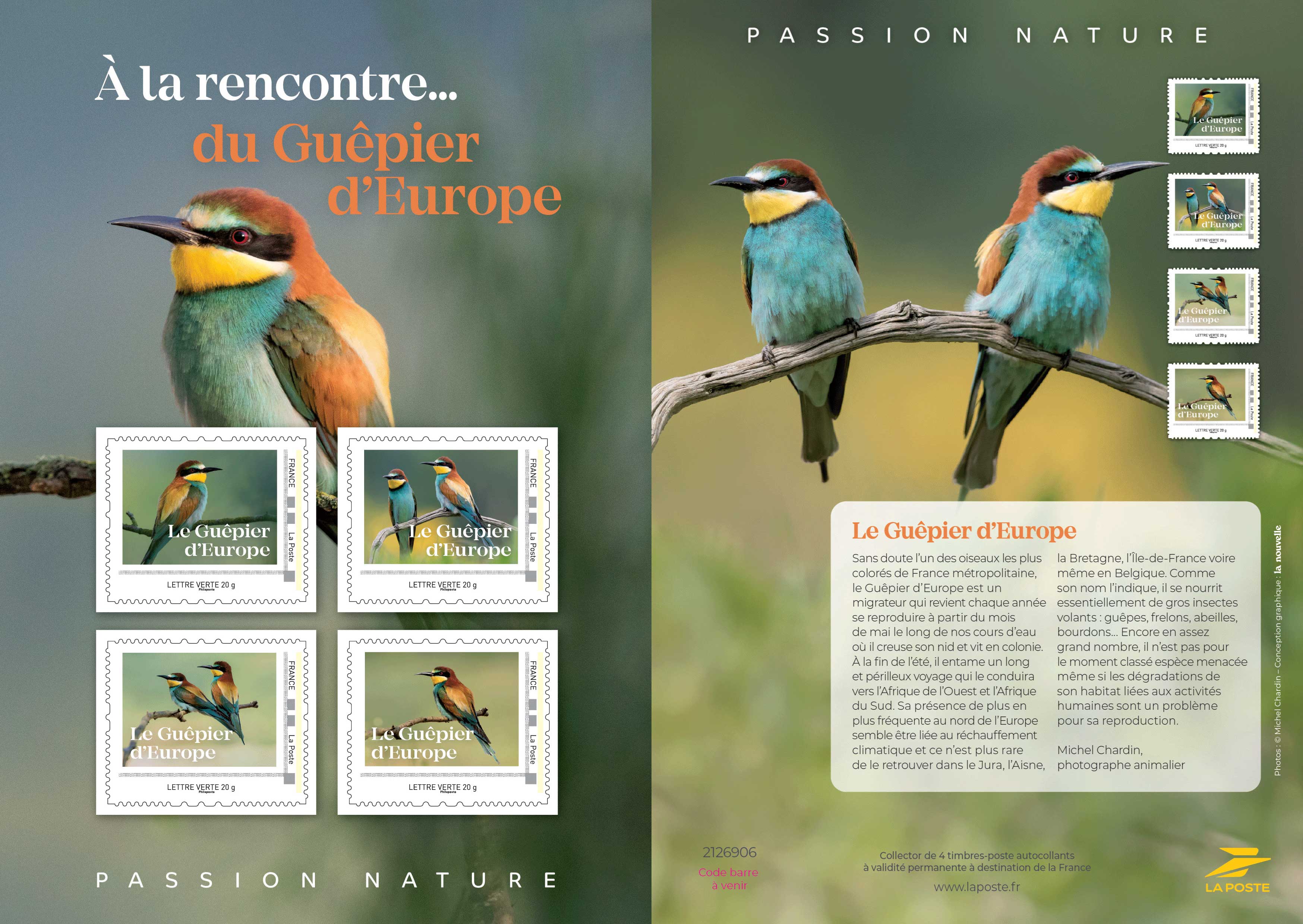 Ce timbre n'est pas encore émis, le visuel et les infos peuvent être erronés.| Description | Émission d'un collector de timbres sur le guêpier d’Europe, oiseau migrateur figurant parmi les oiseaux les plus colorés de France métropolitaine. |