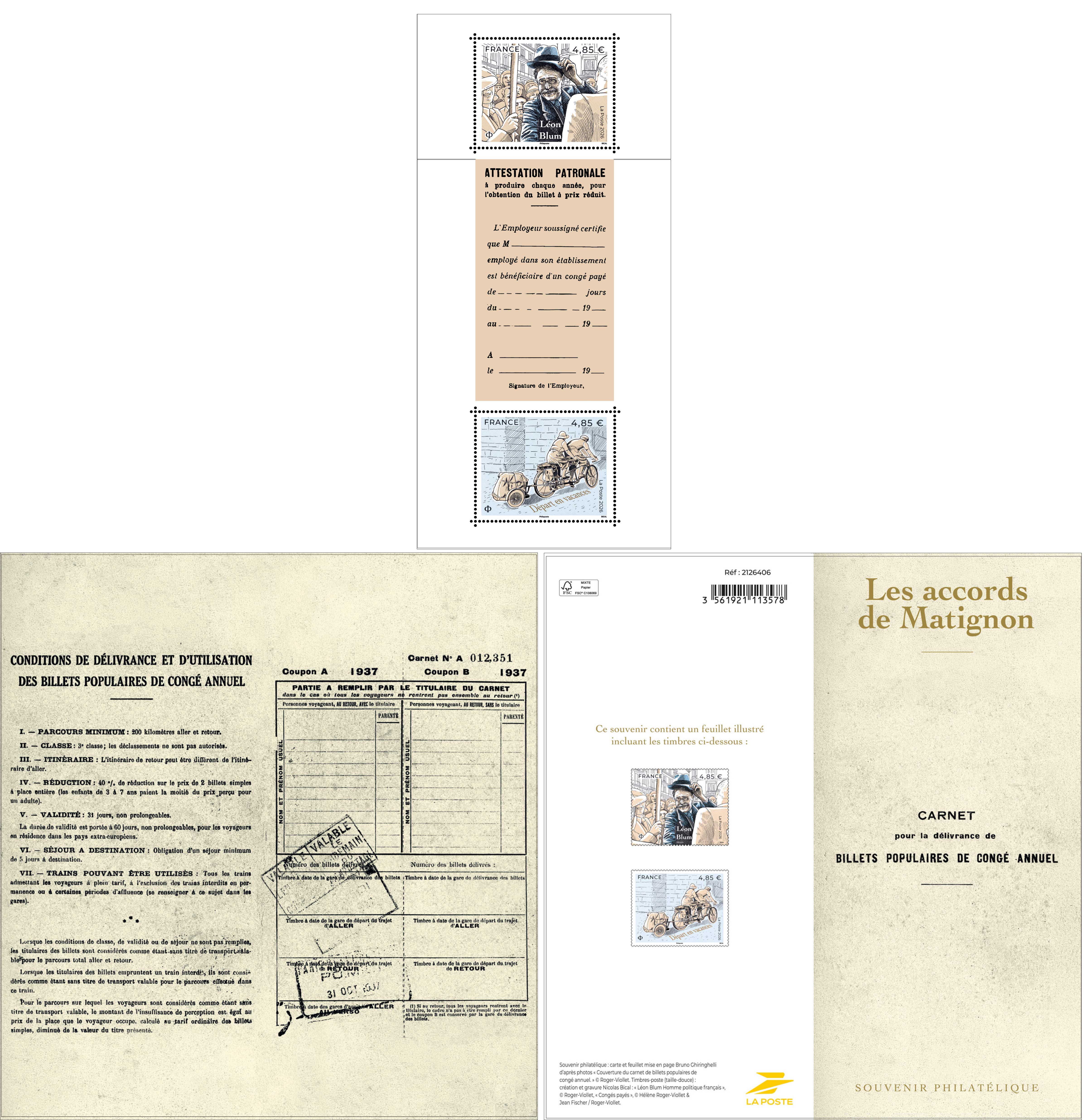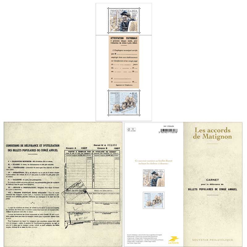 | Description | Émission d'un bloc souvenir, illustré par deux timbres qui mettent à l’honneur les accords de Matignon, instaurés sous la présidence de Léon Blum. |