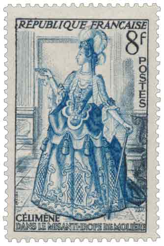 | Commentaire | Visuel : "Le Misanthrope" est une comédie de Jean-Baptiste Poquelin, dit Molière (1622-1673, comédien et dramaturge) en cinq actes et en vers représentée pour la première fois le 4 juin 1666 sur la scène du théâtre du Palais-Royal (édifié 1637 à 1641) à Paris. Alceste hait l'humanité tout entière, en dénonçant l'hypocrisie, la couardise et la compromission. Mais il aime Célimène, jeune veuve coquette et médisante. Il est aimé d'Arsinoé, la prude (amie jalouse) et d'Éliante, la sincère (cousine de Célimène). Émis en France en 1953, le timbre-poste gommé de la série courante représentant Célimène dans Le Misanthrope met à l’honneur le théâtre classique français à travers l’une des figures féminines les plus emblématiques de l’œuvre de Molière ; mis en vente à Paris le 19 septembre 1953 puis dans les autres bureaux du territoire à compter du 21 septembre, ce timbre vertical de 8 francs est destiné à l’affranchissement de la carte postale de cinq mots pour le régime intérieur, usage postal courant qui explique un tirage élevé et une large diffusion ; dessiné par Robert Cami et gravé en taille-douce par René Cottet, il s’inscrit dans la tradition française de la gravure postale soignée, la taille-douce rotative permettant un rendu précis des traits et une mise en valeur élégante du personnage ; le choix de Célimène, marquise spirituelle et incisive, reflète la dimension de comédie de mœurs du Misanthrope, pièce créée en 1666, souvent considérée comme une œuvre plus faite pour être lue que jouée, et dont le personnage n’acquiert tout son sens dramatique qu’en opposition à Alceste, incarnant ainsi les tensions morales et sociales du XVIIᵉ siècle, une lecture critique largement partagée par l’histoire littéraire. |