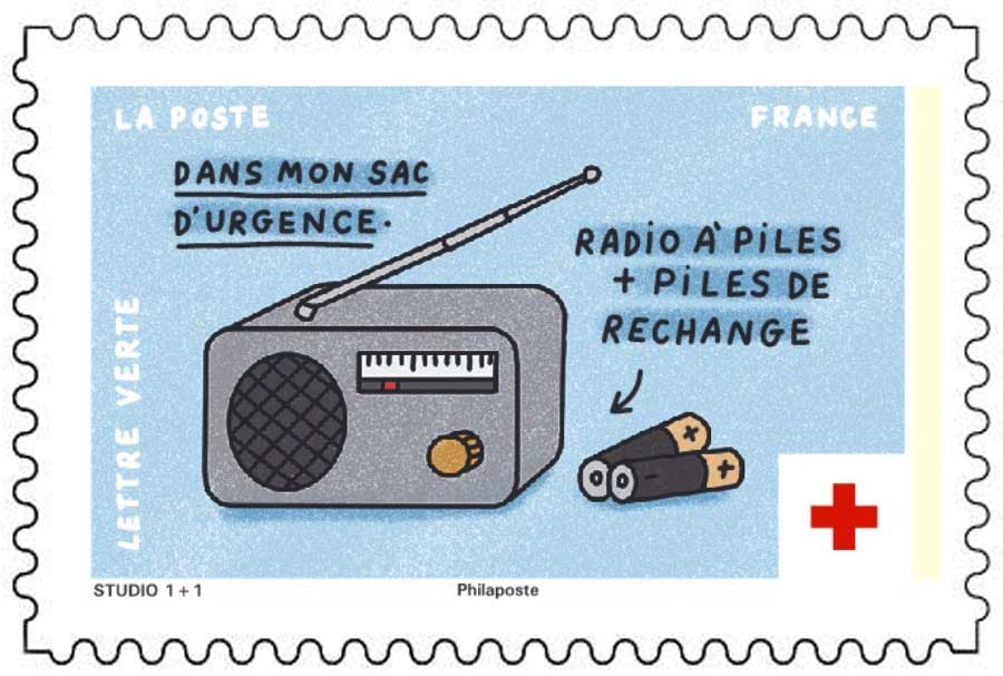 | Description | Provenant du carnet de 10 timbres-poste dédié au sac d’urgence. Inondation, tempête, incendie, séisme, accident industriel, pandémie... parce qu'une crise majeure peut bouleverser la vie quotidienne il faut se préparer à faire face. La Croix-Rouge française encourage chaque foyer à préparer un sac d’urgence. |