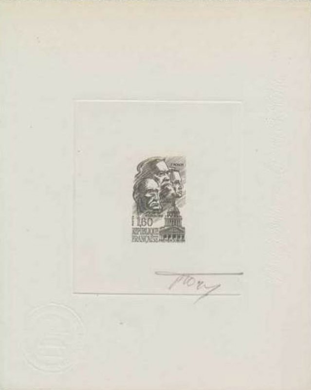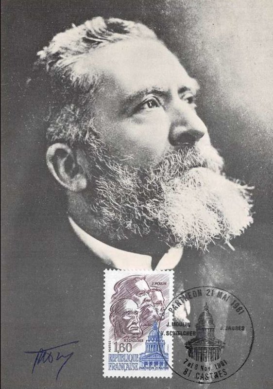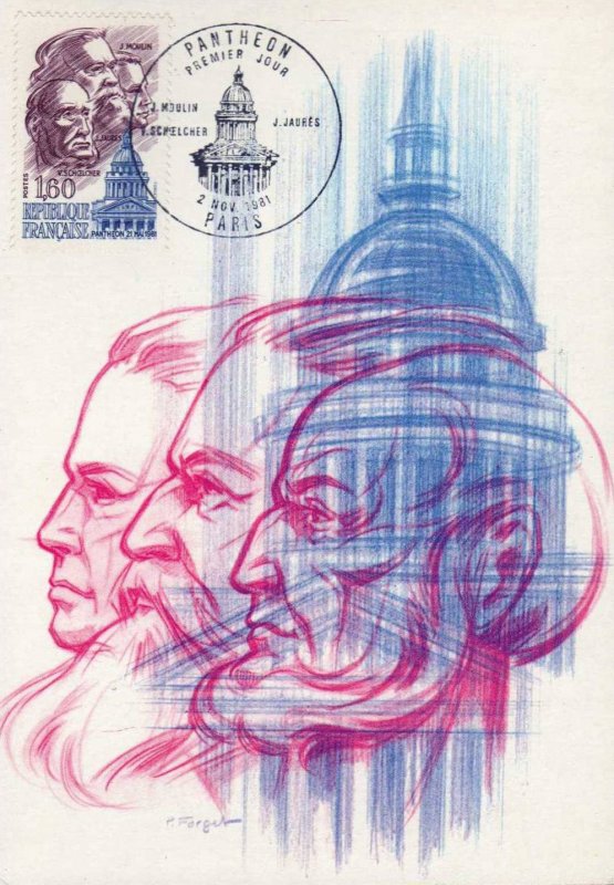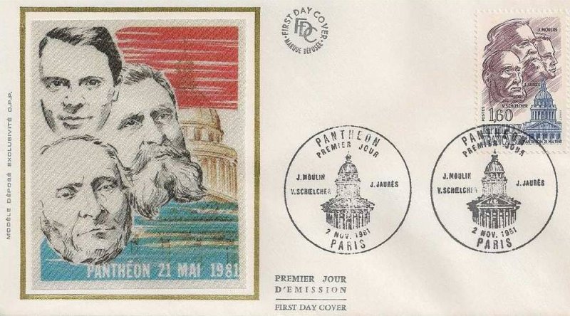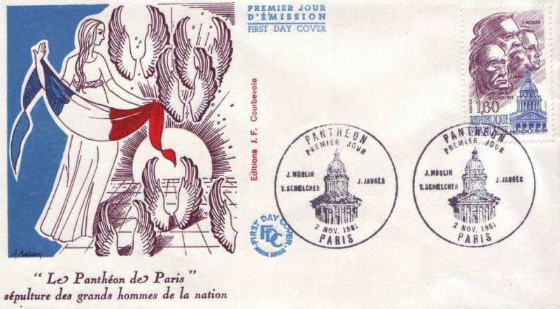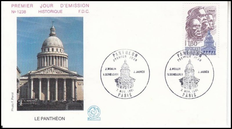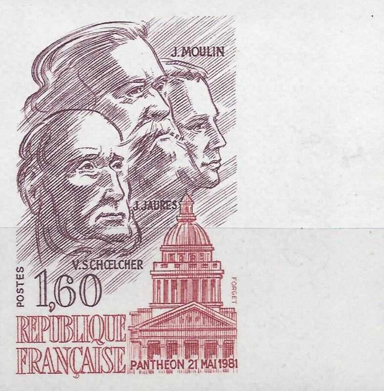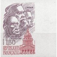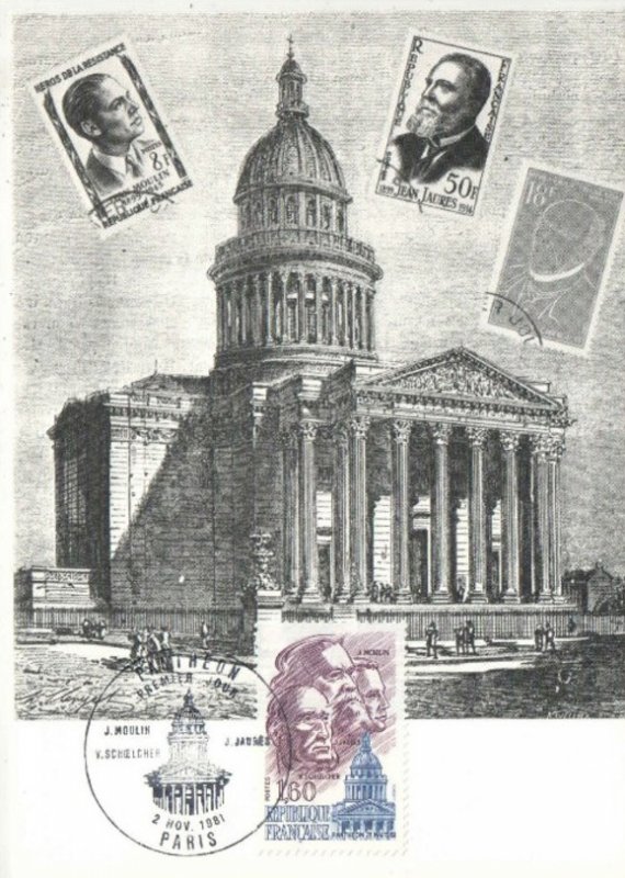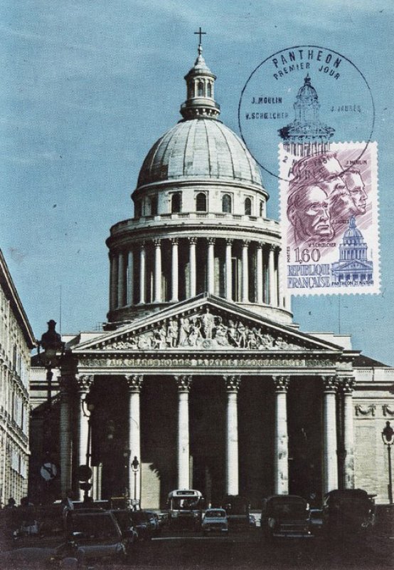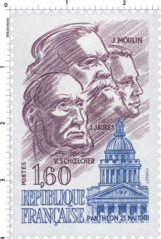 | Description | Panthéon. Le 21 mai 1981, le septennat de François Mitterrand s'ouvre par une cérémonie au Panthéon, durant laquelle le nouveau président rend hommage à Jean Jaurès (Tarn), Jean Moulin (Hérault) et Victor Schœlcher (Paris), en déposant des roses rouges |
