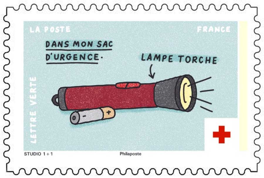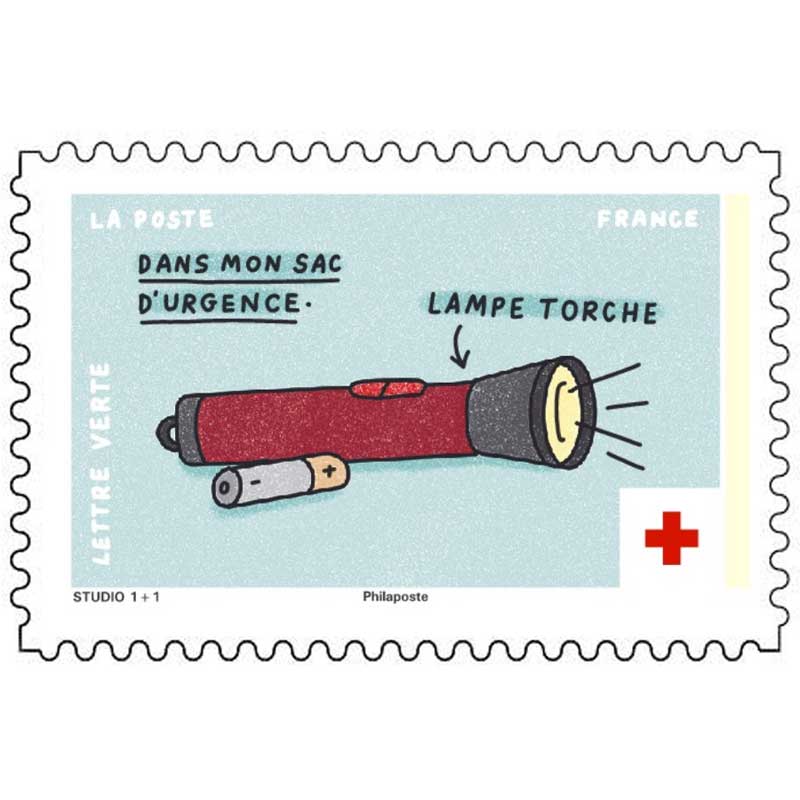 | Description | Provenant du carnet de 10 timbres-poste dédié au sac d’urgence. Inondation, tempête, incendie, séisme, accident industriel, pandémie... parce qu'une crise majeure peut bouleverser la vie quotidienne il faut se préparer à faire face. La Croix-Rouge française encourage chaque foyer à préparer un sac d’urgence. |