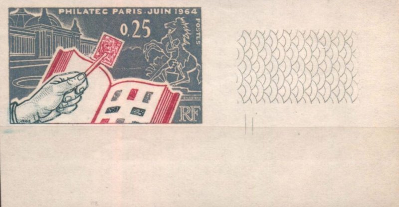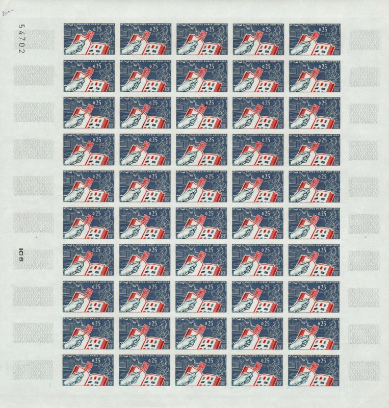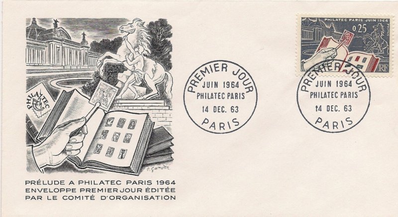 | Commentaire | Contexte et objectifs de l’exposition PHILATEC 1964En juin 1964 se tient à Paris PHILATEC, une Exposition philatélique internationale d’envergure. Organisée au Grand Palais du 5 au 21 juin 1964, cette manifestation vise à célébrer les avancées des services postaux et à promouvoir la philatélie à l’échelle mondiale . Il s’agit de la première grande exposition philatélique en France depuis le centenaire du timbre français en 1949 (CITEX). PHILATEC s’adresse autant aux collectionneurs qu’au grand public curieux des postes. Outre les présentations de collections de timbres, l’exposition met en vitrine les dernières innovations techniques de la Poste et des Télécommunications (tri mécanisé, télécommunications, etc.). Un bureau de poste temporaire est même installé sur place, offrant aux visiteurs la possibilité d’expédier du courrier avec un cachet spécial de l’exposition Dès 1963, les PTT décident d’annoncer l’événement en émettant un timbre commémoratif spécifique. Ce timbre-poste « PHILATEC – Paris Juin 1964 », émis en novembre 1963 en prélude à l’exposition, a pour fonction de publiciser et de valoriser l’exposition à venir auprès du public philatéliste français. Un timbre au service de la philatélie françaiseVisuellement, le timbre de 1963 évoque directement le monde philatélique et le lieu de l’exposition. Son illustration montre une main ajoutant un timbre dans un album ouvert, sur fond de silhouette du Grand Palais accompagnée du célèbre Cheval de Marly des Champs-Élysées. Ce visuel symbolise la rencontre de la tradition (la collection de timbres) et du prestige parisien. Pour marquer le caractère exceptionnel de l’émission, le timbre est imprimé en mini-feuilles de 8 exemplaires comportant en marge la mention commémorative « EXPOSITION INTERNATIONALE PHILATEC PARIS 1964 ». Ce conditionnement inhabituel en fait un souvenir apprécié des collectionneurs de l’époque. PHILATEC 1964 renforce le rayonnement de la philatélie française : le timbre d’annonce de 1963 s’inscrit dans une tradition de timbres commémoratifs liés aux grandes expositions (après CITEX 1949, il préfigure d’autres émissions pour Philexfrance dans les décennies suivantes). Lors de l’ouverture de PHILATEC, un bloc-feuillet spécial à surtaxe, hommage au classique « Type Blanc » de 1900, sera d’ailleurs émis sur place, confirmant la volonté des PTT de conjuguer histoire postale et promotion du loisir philatélique. Aujourd’hui, le timbre PHILATEC 1964 de 1963 conserve une valeur symbolique plus qu’économique. Tiré à des millions d’exemplaires, il reste facile à trouver et n’a qu’une cote modeste d’environ 0,30 € en neuf***. Son intérêt philatélique réside surtout dans son contexte d’émission et le rôle qu’il a joué pour fédérer les collectionneurs autour d’un événement marquant de la philatélie française. ©WikiTimbres