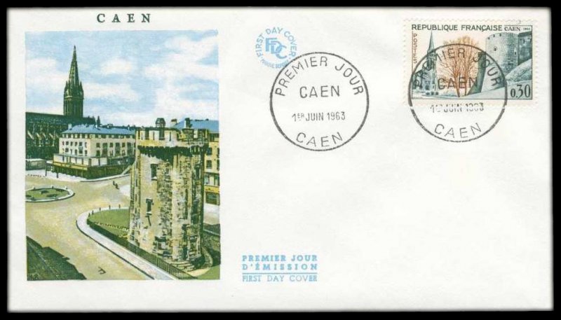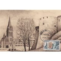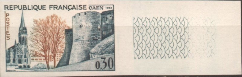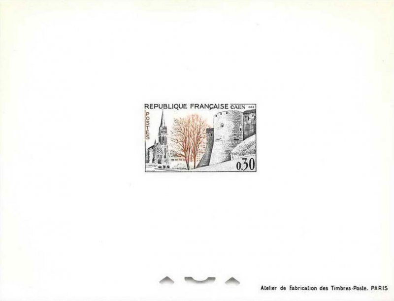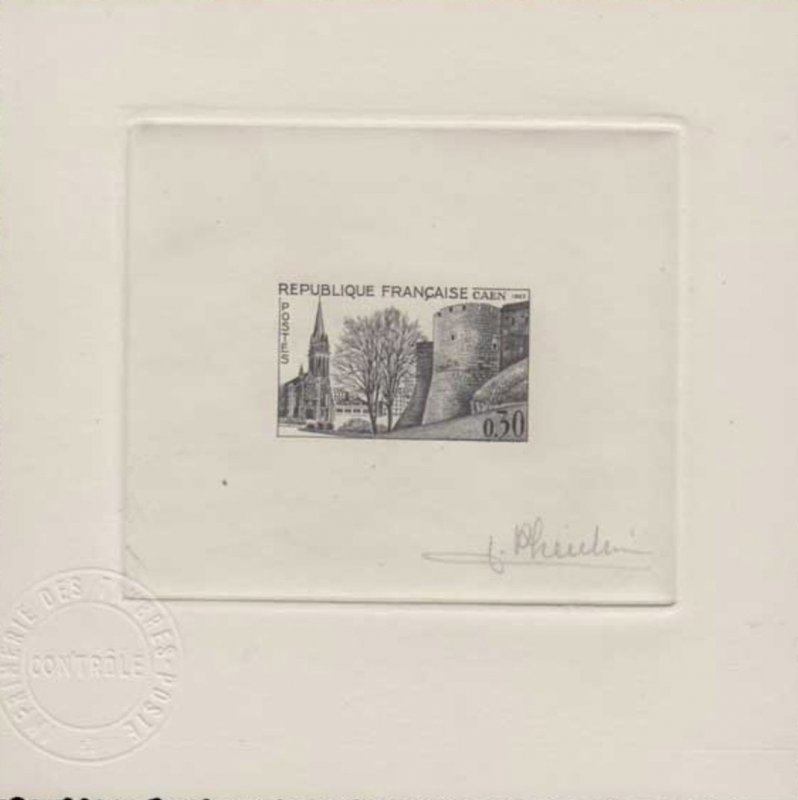 | Commentaire | Le timbre « Caen – 1963 », émis à l’occasion du 36e Congrès national de la Fédération des sociétés philatéliques françaises, offre un regard élégant sur le patrimoine architectural de la ville. Le visuel, conçu et gravé par Jean Pheulpin, se distingue par une composition serrée, presque picturale : une tour crénelée, probablement inspirée du château ducal, se détache à droite, tandis qu’un clocher d’église s’élève à gauche, encadré de frondaisons stylisées. L’ensemble dégage une atmosphère calme, intemporelle, renforcée par une palette de brun et de gris-bleu à la fois sobre et raffinée. Ce timbre ne commémore pas un événement historique en tant que tel, mais célèbre la philatélie elle-même, en rendant hommage à la ville qui accueille ce grand rassemblement d’amateurs et de collectionneurs. Caen, en plein renouveau dans les années 60, illustre alors un équilibre entre tradition et modernité. Marquée par la guerre mais fière de son passé, elle s’impose comme une ville de culture, de mémoire et de reconstruction. Le choix de Pheulpin n’est pas anodin : son style net, précis, sans surcharge, convient parfaitement à cette ambition. Il parvient à exprimer la noblesse d’un lieu sans tomber dans la carte postale touristique. La taille-douce, sa spécialité, donne du corps aux pierres et du relief aux feuillages. C’est une ville qu’il grave avec respect, presque avec tendresse. L’émission, bien que liée à un événement ponctuel, a su traverser les décennies. Elle reste recherchée, non pour sa rareté, mais pour ce qu’elle dit : l’attachement d’une communauté de passionnés à une ville et à un art discret mais essentiel. ©WikiTimbres |