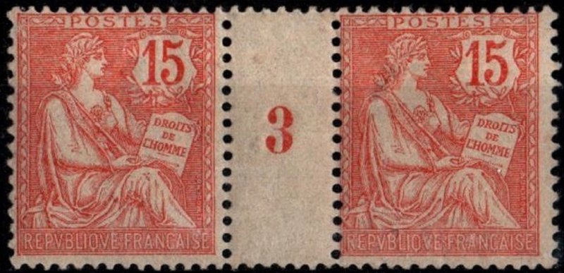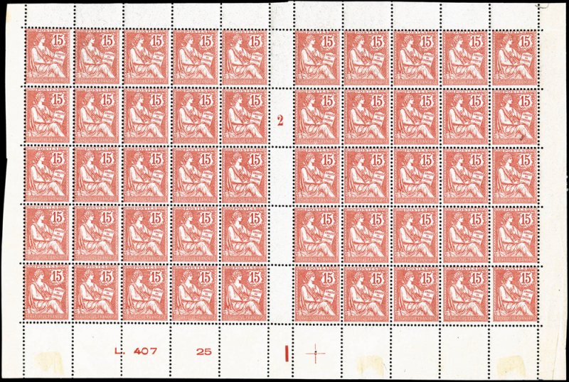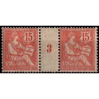 Comme le 10 c retouché émis six mois plus tôt, ce 15 c vermillon est imprimé en typographie sur feuilles de 150 timbres, dentelés 14 × 13½. Bien que les quantités exactes ne soient pas connues, il s’agit d’une émission brève, retirée dès avril 1903, ce qui en fait un timbre intéressant pour les spécialistes des Mouchon. Les plis de période (fin 1902–printemps 1903) sont particulièrement recherchés, car le timbre n’a circulé que quelques mois avant l’arrivée massive de la Semeuse 15 c vert, qui prend définitivement le relais dans l’affranchissement de la lettre simple.