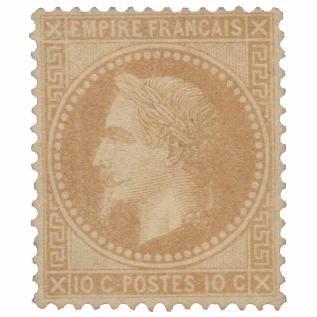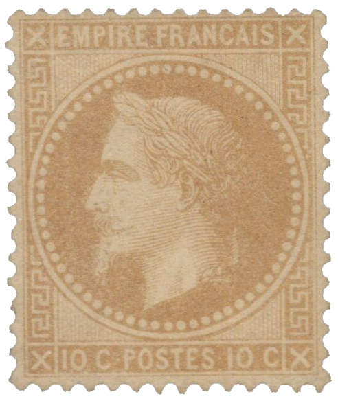 | Commentaire | Napoléon III - Empire lauré. Type I (petits points). Émis en octobre 1867, le 10 centimes bistre type I appartient à la série au type Napoléon III lauré, issue de la modernisation du portrait impérial opérée à partir de 1862. Désiré-Albert Barre conserve le cadre et la présentation des valeurs précédentes, mais ajoute la couronne de laurier, symbole politique adopté à l’apogée du régime.
