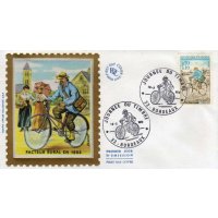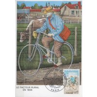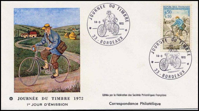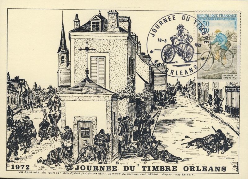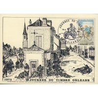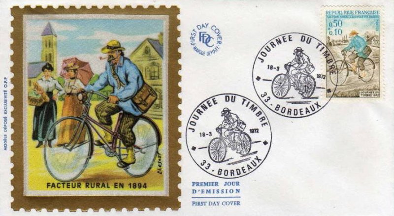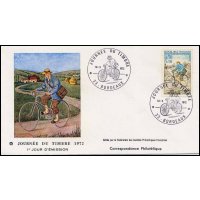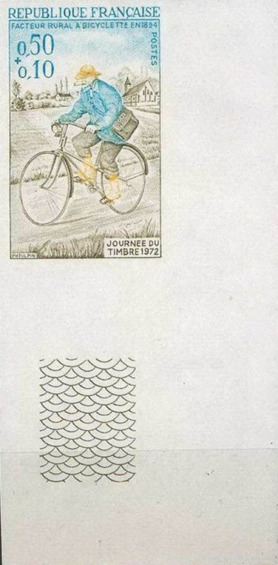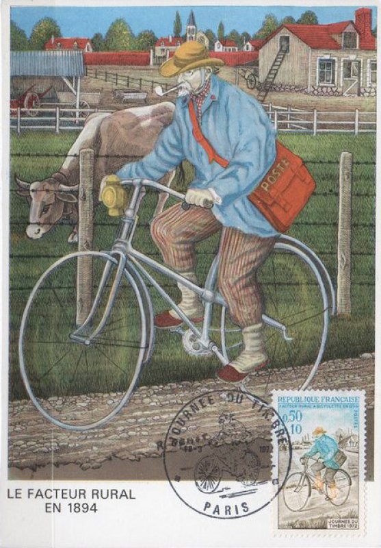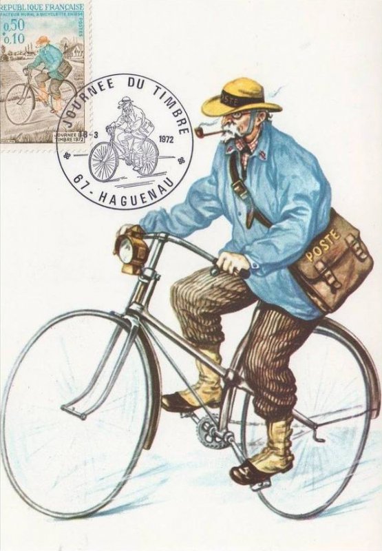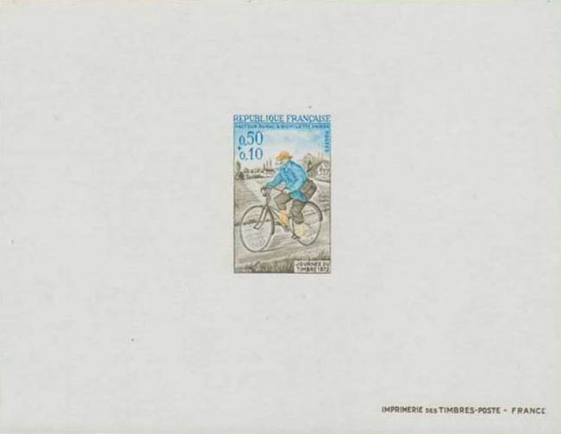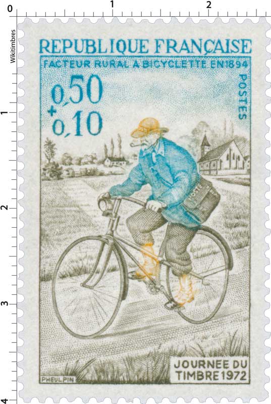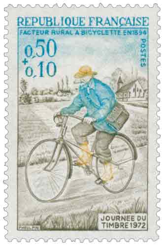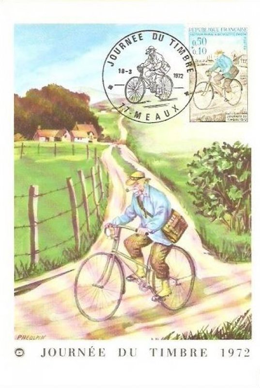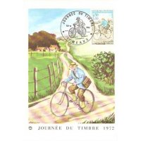 | Description | Journée du timbre 1972. Facteur rural à bicyclette et vue de l'Église de Champignelles (Yonne) |