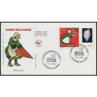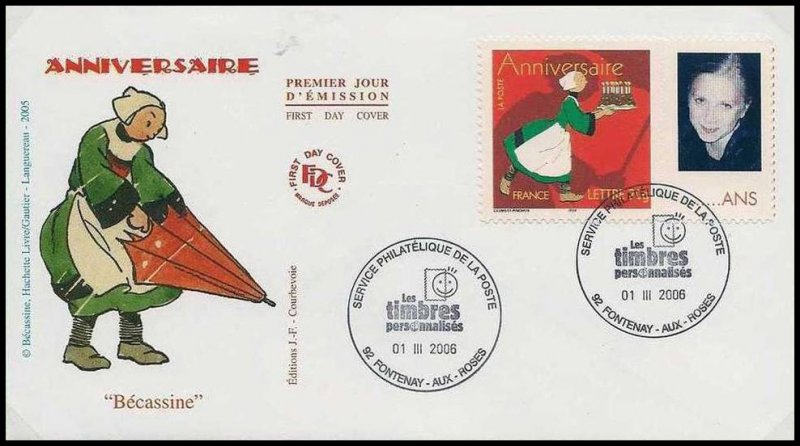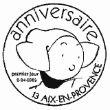 | Commentaire | Il était légitime que Bécassine, qui fêtera ses 100 ans en 2005, illustre cette année là le timbre Anniversaire. Ce personnage à la bouille ronde surmontée d’une coiffe à ailettes, vêtu d’un tablier blanc sur une robe vert pomme et doté d’un parapluie rouge a été imaginé par Pinchon pour le journal La semaine de Suzette. Le personnage y accompagnait les textes de Caumery (pseudonyme de Maurice Languereau, l’éditeur). Née Anaïk Labornez à Clocher-les-Bécasses, cette petite bonne bretonne, au service de Madame de Grand’Air, puis gouvernante de Loulotte, doit à sa tendre naïveté et à son inexpérience de vivre des péripéties rocambolesques et invraisemblables. Les aventures de Bécassine appartiennent à l’imaginaire de la BD et sont le témoignage de toute une époque. Timbre sans millésime |