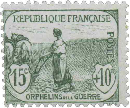 | Commentaire | Femme au labour - Orphelins de la Guerre. Démonétisé le :31/10/1922. Timbre erroné, le graveur a omis de représenter les rênes permettant à l’agricultrice de conduire son attelage. A l’époque, certains parlementaires en firent la remarque au ministre des Postes Émis en août 1917, le timbre caritatif 15 c + 10 c Orphelins de la guerre – Femme labourant (YT 150) inaugure la série destinée au financement des Pupilles de la Nation. Dessiné par Louis Dumoulin et gravé par Léon Henri Ruffé, il montre une paysanne labourant la terre en l’absence de son mari parti au front, image puissante de la France rurale qui continue de vivre malgré la guerre. Imprimé en typographie, dentelé 13½ × 14, tiré en feuilles de 150 timbres, ce timbre se distingue par sa teinte gris vert et par une surtaxe de 10 centimes destinée aux orphelins de guerre. L’émission, bien que symboliquement forte, fut peu utilisée : les visuels jugés sombres et la surtaxe élevée ont freiné son adoption par le public. Répertorié Yvert & Tellier n° 150, il occupe une place majeure dans les collections liées à la Grande Guerre, aux timbres de charité et aux séries Orphelins de la guerre, dont il constitue l’un des visuels les plus emblématiques. |