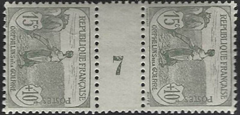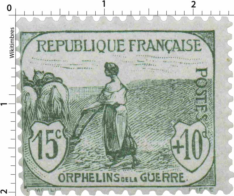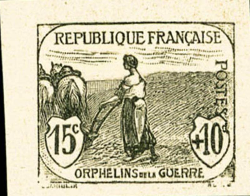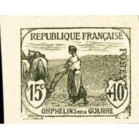 | Commentaire | Femme au labour - Orphelins de la Guerre. Démonétisé le :31/10/1922. Timbre erroné, le graveur a omis de représenter les rênes permettant à l’agricultrice de conduire son attelage. A l’époque, certains parlementaires en firent la remarque au ministre des Postes Émis en août 1917, le timbre caritatif 15 c + 10 c Orphelins de la guerre – Femme labourant (YT 150) inaugure la série destinée au financement des Pupilles de la Nation. Dessiné par Louis Dumoulin et gravé par Léon Henri Ruffé, il montre une paysanne labourant la terre en l’absence de son mari parti au front, image puissante de la France rurale qui continue de vivre malgré la guerre. Imprimé en typographie, dentelé 13½ × 14, tiré en feuilles de 150 timbres, ce timbre se distingue par sa teinte gris vert et par une surtaxe de 10 centimes destinée aux orphelins de guerre. L’émission, bien que symboliquement forte, fut peu utilisée : les visuels jugés sombres et la surtaxe élevée ont freiné son adoption par le public. Répertorié Yvert & Tellier n° 150, il occupe une place majeure dans les collections liées à la Grande Guerre, aux timbres de charité et aux séries Orphelins de la guerre, dont il constitue l’un des visuels les plus emblématiques. |