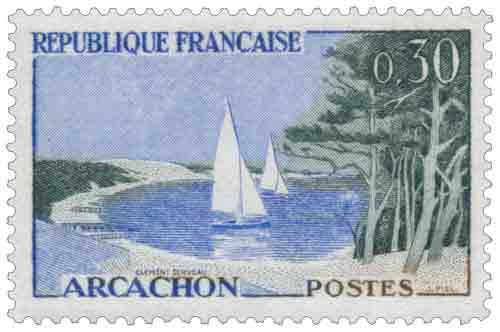 | Commentaire | Bassin d'Arcachon et au fond du timbre la dune du Pyla. Émis par la France en 1961 dans la série touristique d’usage courant, le timbre-poste consacré à Arcachon illustre la politique postale de mise en valeur des grands sites littoraux à une période marquée par l’essor du tourisme balnéaire et la démocratisation des déplacements, le choix du bassin d’Arcachon, avec la dune du Pilat en arrière-plan, traduisant l’image d’un territoire associant nature, loisirs et activités économiques traditionnelles telles que l’ostréiculture, tandis que la représentation synthétique du plan d’eau, des forêts de pins et de l’ouverture maritime reflète l’identité d’une station passée, en un peu plus d’un siècle, du statut de modeste lieu de pèlerinage à celui de ville touristique majeure de la côte atlantique, ce timbre de 1961 remplissant pleinement sa fonction postale tout en participant à la diffusion d’une iconographie territoriale destinée à accompagner la promotion intérieure et extérieure des paysages français. Article rédigé pour WikiTimbres |