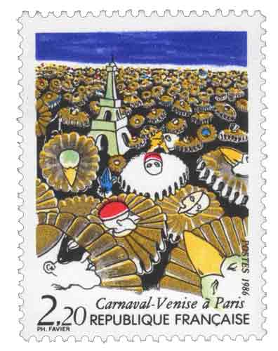 | Commentaire | Ce timbre présente un fort décalage du rouge vers le haut Ce timbre accompagne l’opération culturelle « Venise à Paris », organisée au milieu des années 1980 dans un contexte de regain d’intérêt pour les grandes fêtes populaires européennes et pour les échanges culturels entre capitales. Le carnaval, longtemps perçu comme une tradition locale italienne, retrouve alors une visibilité internationale, nourrie autant par la littérature romantique que par le cinéma contemporain, qui contribue à renouveler son imaginaire. À travers cette émission, l’administration postale française s’inscrit dans une politique d’ouverture aux manifestations culturelles transnationales, en mettant à l’honneur une fête dont la symbolique dépasse largement le cadre géographique de Venise. Le sujet renvoie à l’histoire longue du carnaval comme temps de rupture sociale et de renversement des codes, héritée du Moyen Âge, où le masque permet l’effacement temporaire des identités et l’inversion des rôles. Dans le contexte parisien, cette thématique trouve un écho particulier, la capitale ayant souvent accueilli, depuis le XIXᵉ siècle, bals masqués et défilés inspirés de modèles vénitiens. Ce timbre s’insère ainsi dans une série d’émissions consacrées à des événements culturels et festifs, valorisant la création artistique contemporaine et la circulation des symboles entre villes européennes. Par son sujet, ce timbre rappelle aussi le rôle du carnaval comme espace collectif de créativité et de liberté, tout en soulignant la capacité de la philatélie française à témoigner des grandes tendances culturelles de son époque. Article rédigé pour WikiTimbres |
