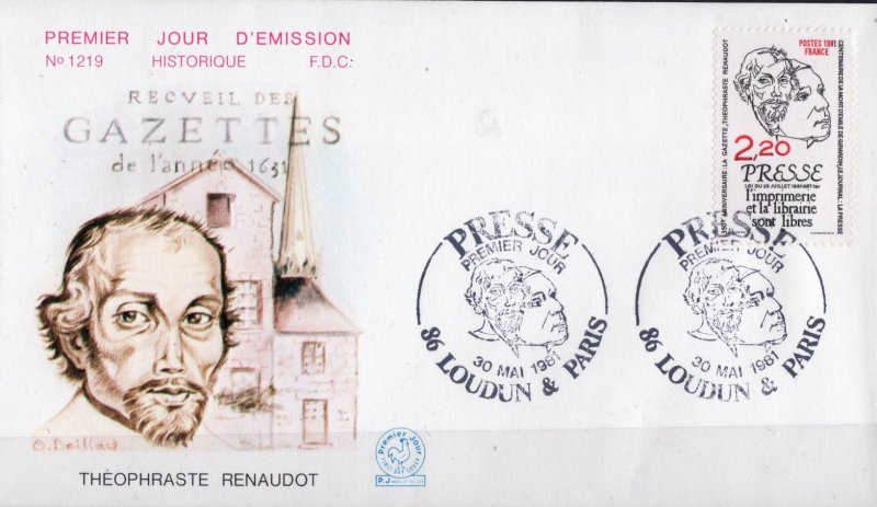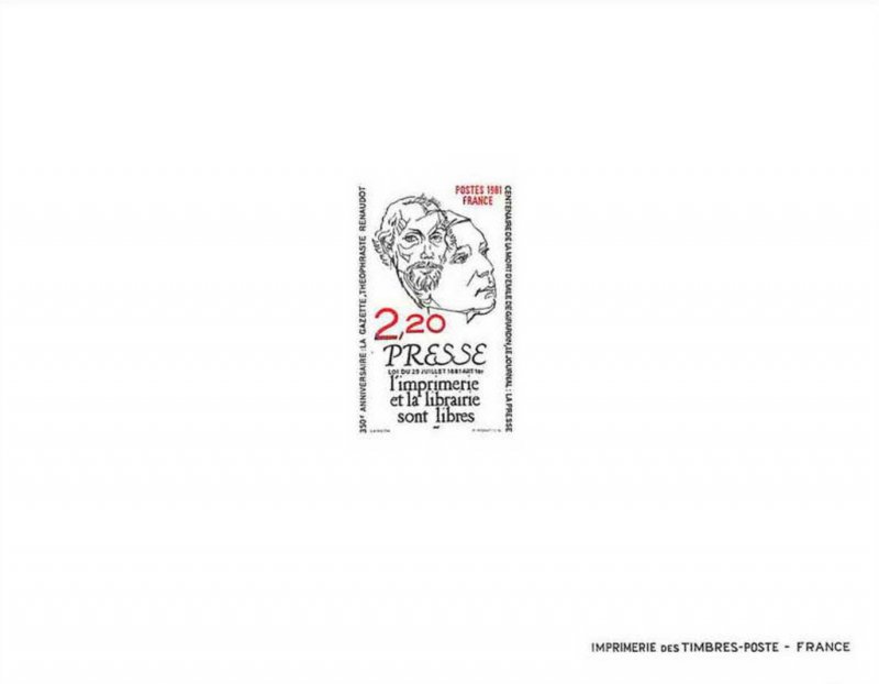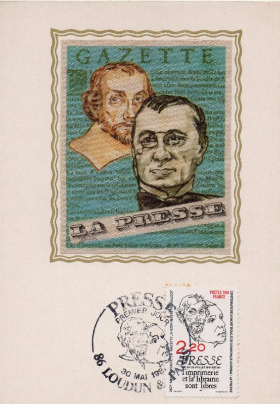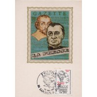 | Description | Centenaire des lois sur la liberté de la presse. Représentation des fondateurs de la presse : Théophraste Renaudot (1586-1653), né à Loudun (Vienne), et Émile de Girardin (1806-1881), né à Paris |